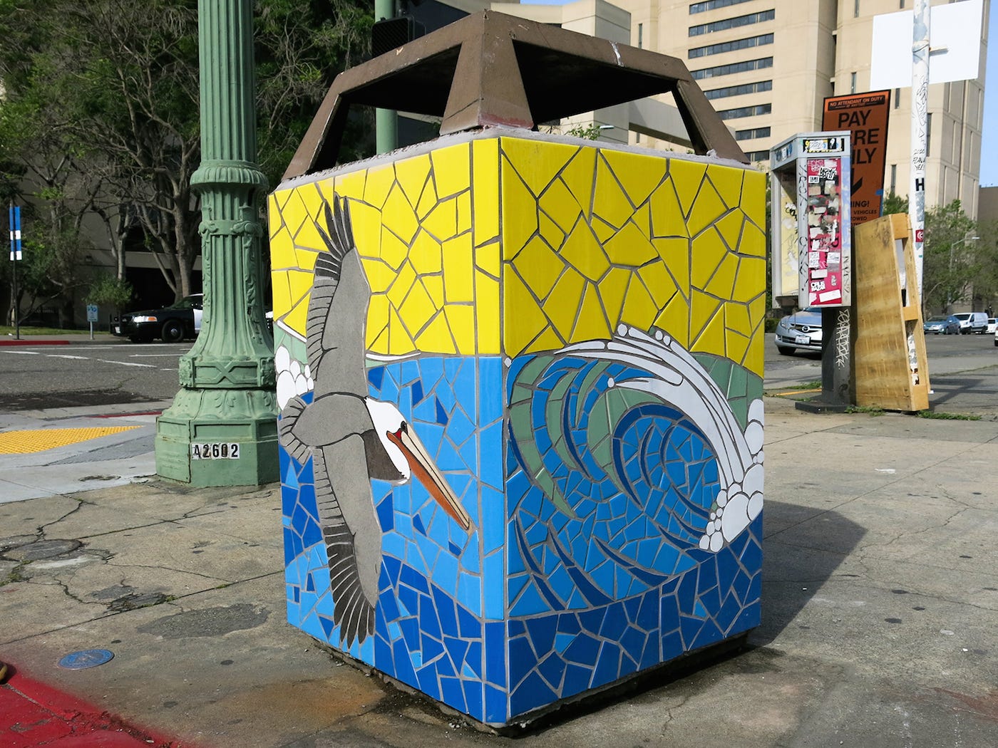 Juan Lopez of New World Mosaics, who was involved in can projects in the Adams Point and Temescal districts, has since been the mosaic artist behind the remaining cans in the neighborhood. An Oakland transplant from Santa Fe, Lopez has brought his tile-setting expertise to this intricate art form. Eng and Lopez decided to give a cohesive look to the cans in this section of the city. They used a three-panel design to create a wrapped image of a native bird, which has become a way to determine if you have stepped within the boundaries of this historic neighborhood. From egrets to quails to the pelican I watched take flight, Old Oakland now has a distinct and consistent look from can to can.