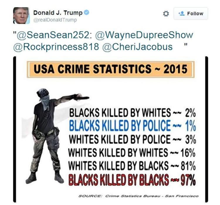 Confronting fascism goes beyond protests, riots and other forms of civil disobedience; we need to confront the gatekeepers who allow the disease to spread. It’s better to prevent than to react. We need to hold the major media corporations accountable for their complacency during the rise of Trump, Yiannopoulos and Richard Spencer. These men’s speech is protected under the First Amendment. But CNN and Twitter are not government institutions — they are privately owned. Why does Twitter allow Trump to share racist memes created by white-supremacist groups citing inaccurate data from a “crime statistics bureau” in San Francisco that doesn’t actually exist (see the image above)? Why did CNN have to air Donald Trump’s campaign rallies? Which leads me to wonder, if former KKK grand wizard and unrepentant anti-Semite David Duke became a ratings asset, would they have done the same thing? Are there any ethical limits to the pursuit of high ratings?