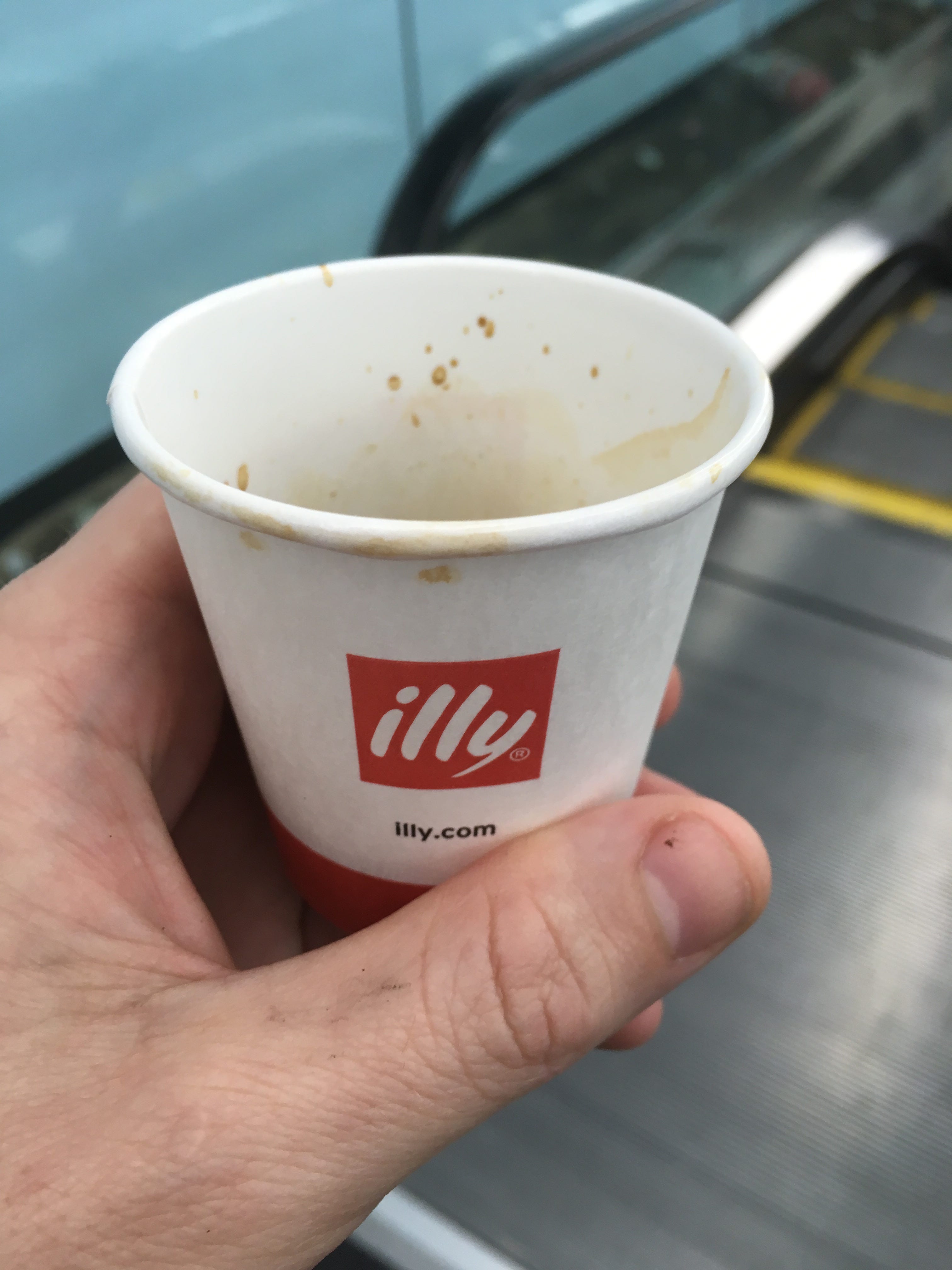 Ah. That means you might have to fill up a few of their little four-ounce paper cups to get properly caffeinated. If you’ve ever been to Italy, perhaps you’ve been to one of those coffee shops where you order your espresso at one end of the counter and down it as you walk to the register at the other end. It’s sort of like that—a quick affair.