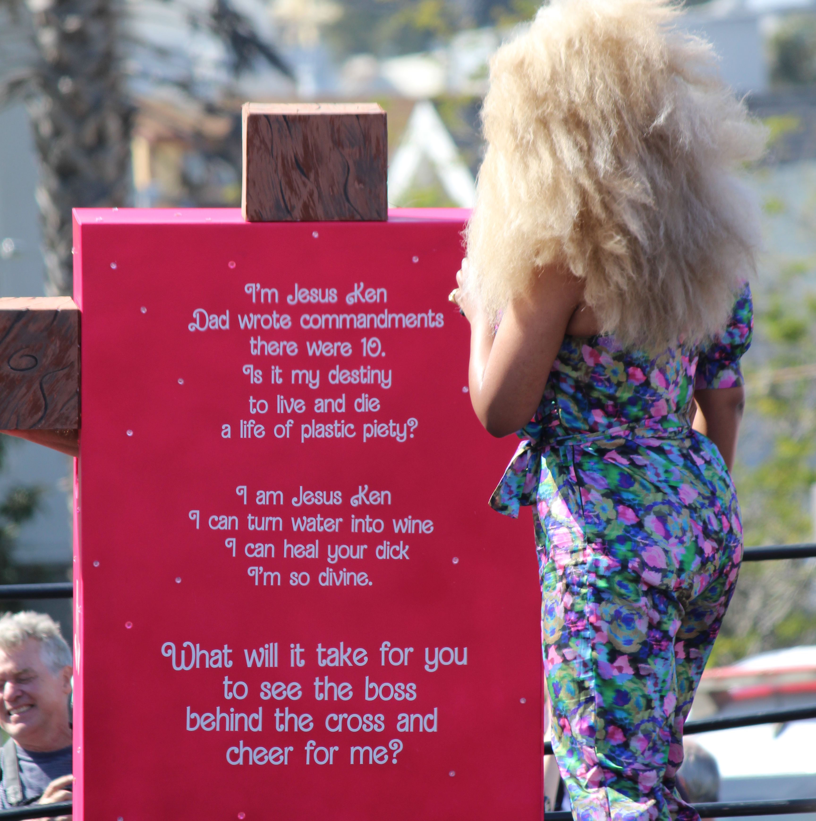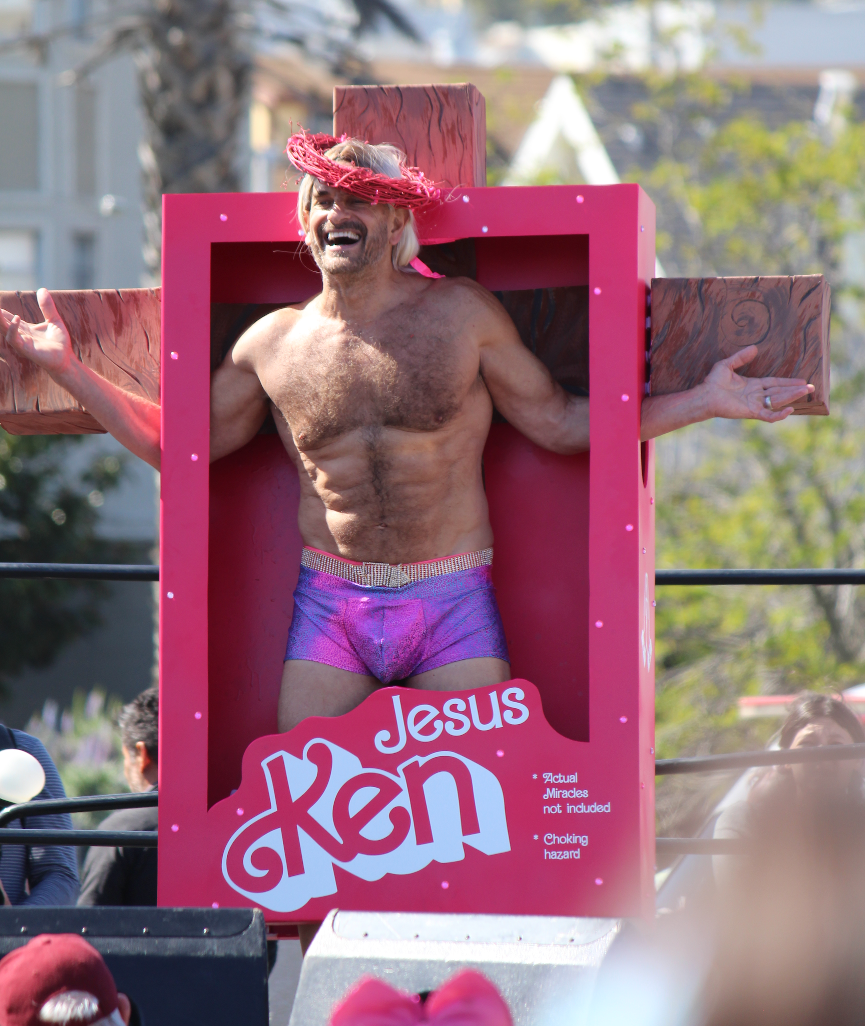 Up next, The Hunky Jesus contest. About a dozen entrants with concepts like “Disco Ball Jesus” with a mirror ball for a head and a message about queer clubs being sacred spaces, “White Trash Jesus” with his PBRs, or “Horny Jesus” with a very prominent latex erection, but one Jesus in particular stood out from the pack. Coming on the heels of the wildly successful Barbie movie it was “Jesus Ken” who would take the crown as the 2024 Hunky Jesus winner.