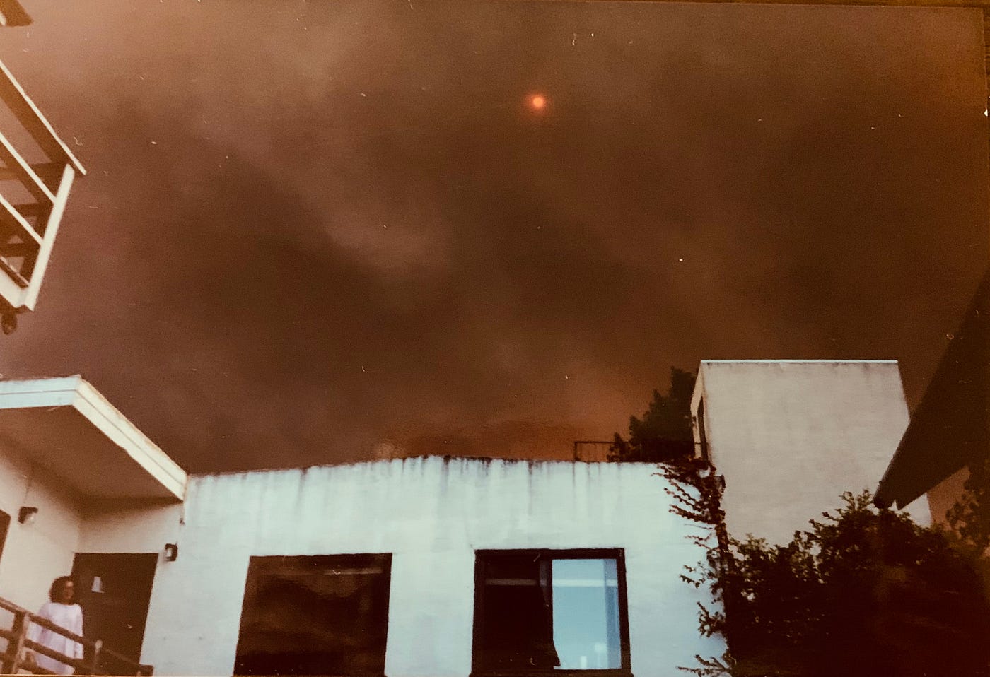 My roommates and I rushed back inside to get our cameras (cell phones didn’t exist yet), unaware of the tragedy that was unfolding in the hills above us. Soon, friends who were forced to evacuate began arriving to stay with us in the Berkeley flatlands. We all went out to eat, squeezing into a booth at a midcentury IHOP. We felt safe there together.