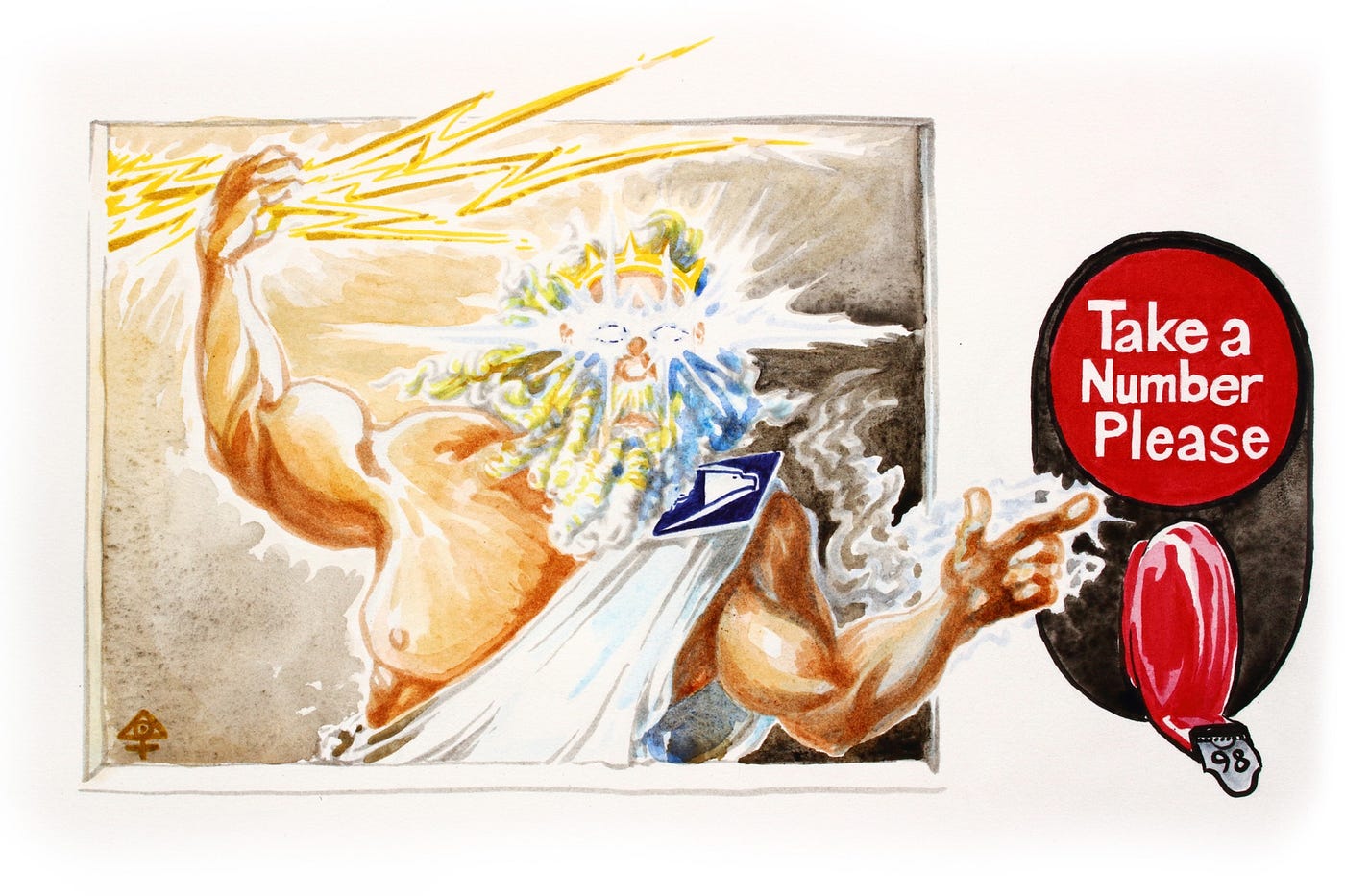Including the clerk, I was one of three people total at the post office. After about five minutes, four other people came in. They each pulled a number from the ticket dispenser beside the clerk and then formed a line behind me. The clerk finished helping the woman ahead of me, and then it was my turn.