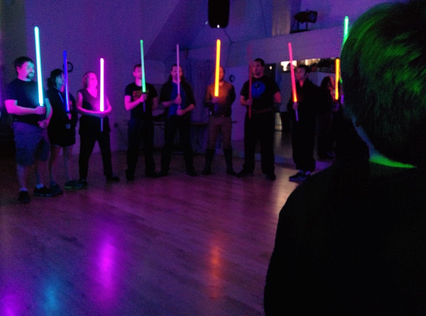 The instructor, Alain Bloch, welcomed attendees and directed us to a pile of high-quality lightsabers that are loaned out during classes. He handed me — nay, bestowed upon me — a Luke Skywalker replica. After a surprisingly intense warm-up and stretching routine, we learned a series of spins and flourishes that combined into figure eights. Then we learned a few attacking and defensive choreography basics before breaking into pairs to practice, with Padawans like myself paired with more experienced attendees.