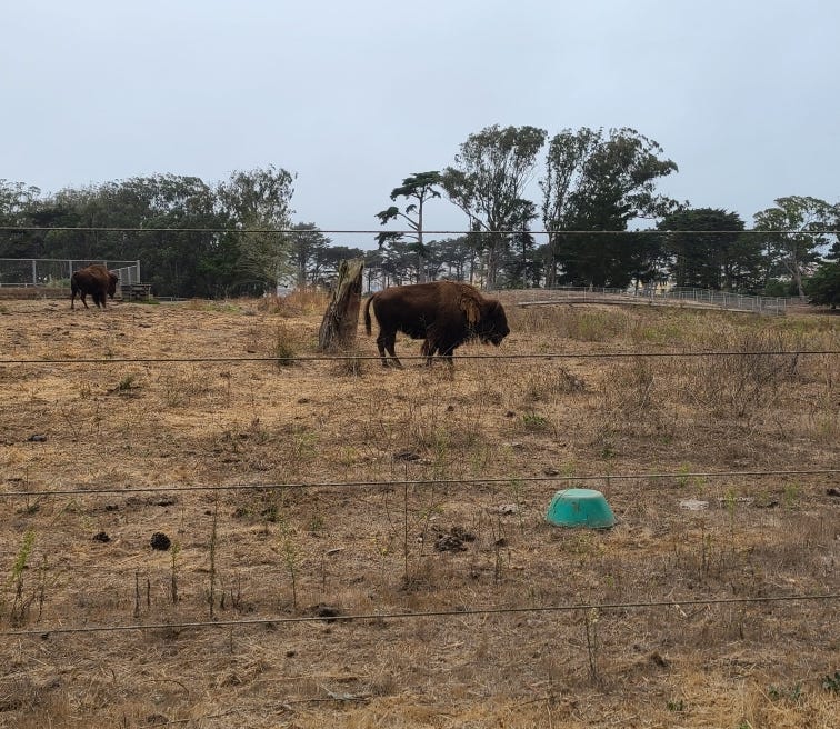 The Golden Gate Park Dog Training Area is like the Chase Center of dog parks. Under normal circumstances, Kayla and I sometimes find ourselves the creeps who hang out at dog parks unaccompanied by a furry friend, but this was something different. Dozens of dogs chased each other, shitting everywhere. We sat down to rest our legs, choosing a bench that seemed to have a great view. Unfortunately, it was just on the other side of the fence from where every dog within a 10-mile radius must come to shit. There was so much shit, in fact, that we decided the bison pen must smell better.