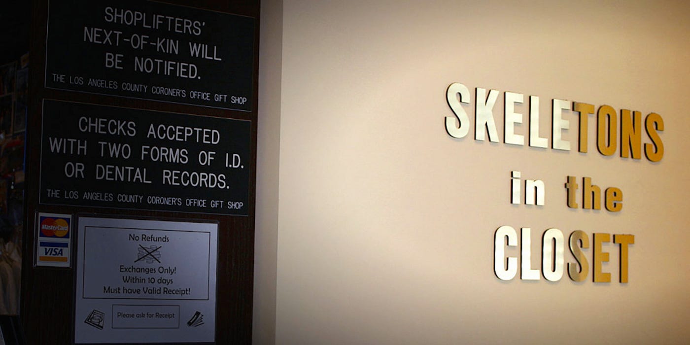 Skeletons In The Closet Gift Store’s origins are tied to the most mundane of items: the coffee mug. Given away as a parting gift for attendees participating in a county training program, the mug immediately proved a highly desirable and oft requested souvenir, becoming the first item sold at the coroner’s shoebox-sized retail arm initially catering to those in the professional fields of investigating death and homicide. And it was back in 1992 when former secretary Marilyn Lewis designed a beach towel adorned with an illustration of a crime scene chalk outline (which remains a best seller). With every unexpected appearance at beaches near and far, the morbid design helped spread word about Skeletons In The Closet Gift Store’s gallows humor merchandise, even showing upon the pages of international tourist guide books as a left field Los Angeles macabre destination.