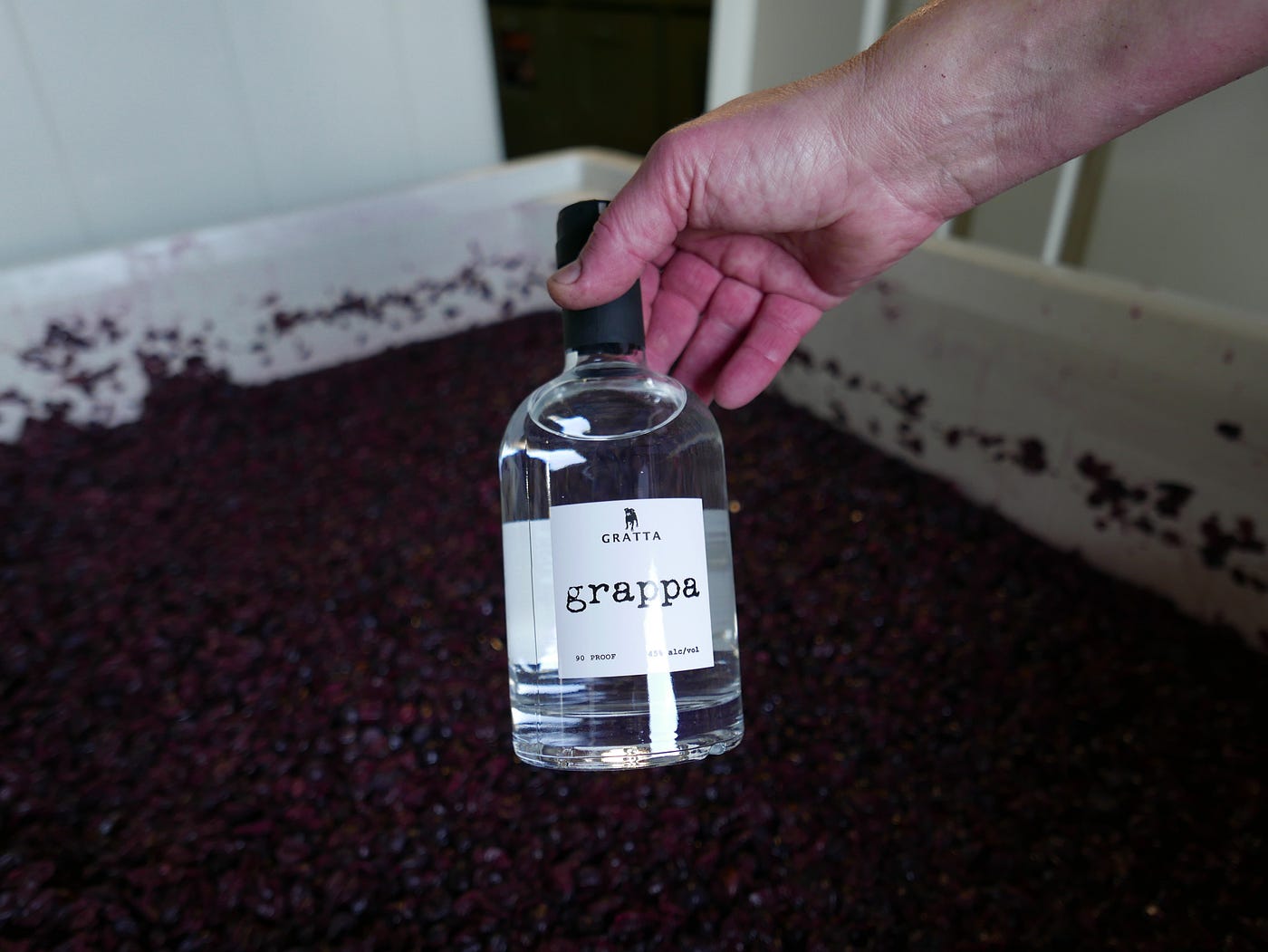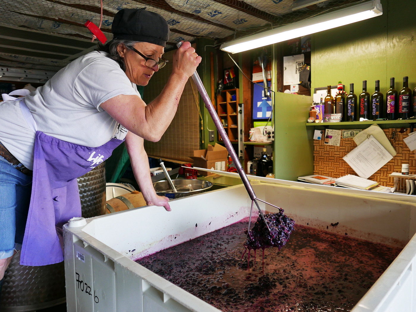Thursday through Sunday, you’ll find Gratta standing behind the seven-seat bar in her uniform black hat and black T-shirt with her winery’s logo — her hands usually stained purple. Today, she makes and serves wines that honor her Italian roots, but she also uses the leftover seeds, skins and stems to distill grappa, a centuries-old pomace brandy from Italy.