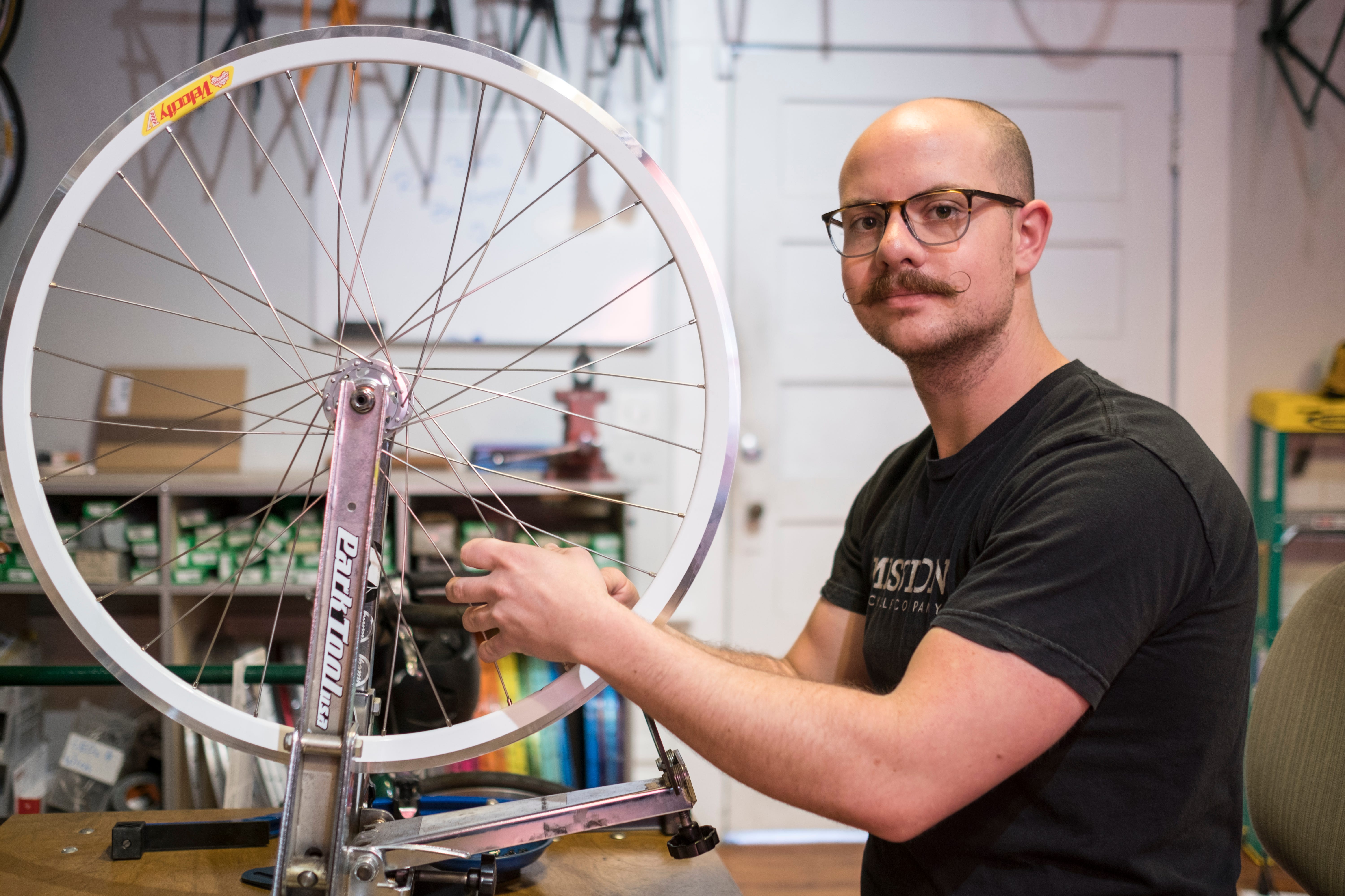 Jefferson puts the final touches on a bike that’s nearly fully assembled.