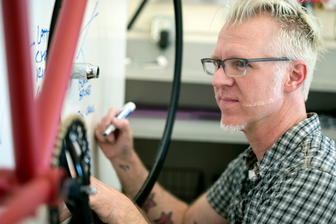 Jefferson puts the final touches on a bike that’s nearly fully assembled.