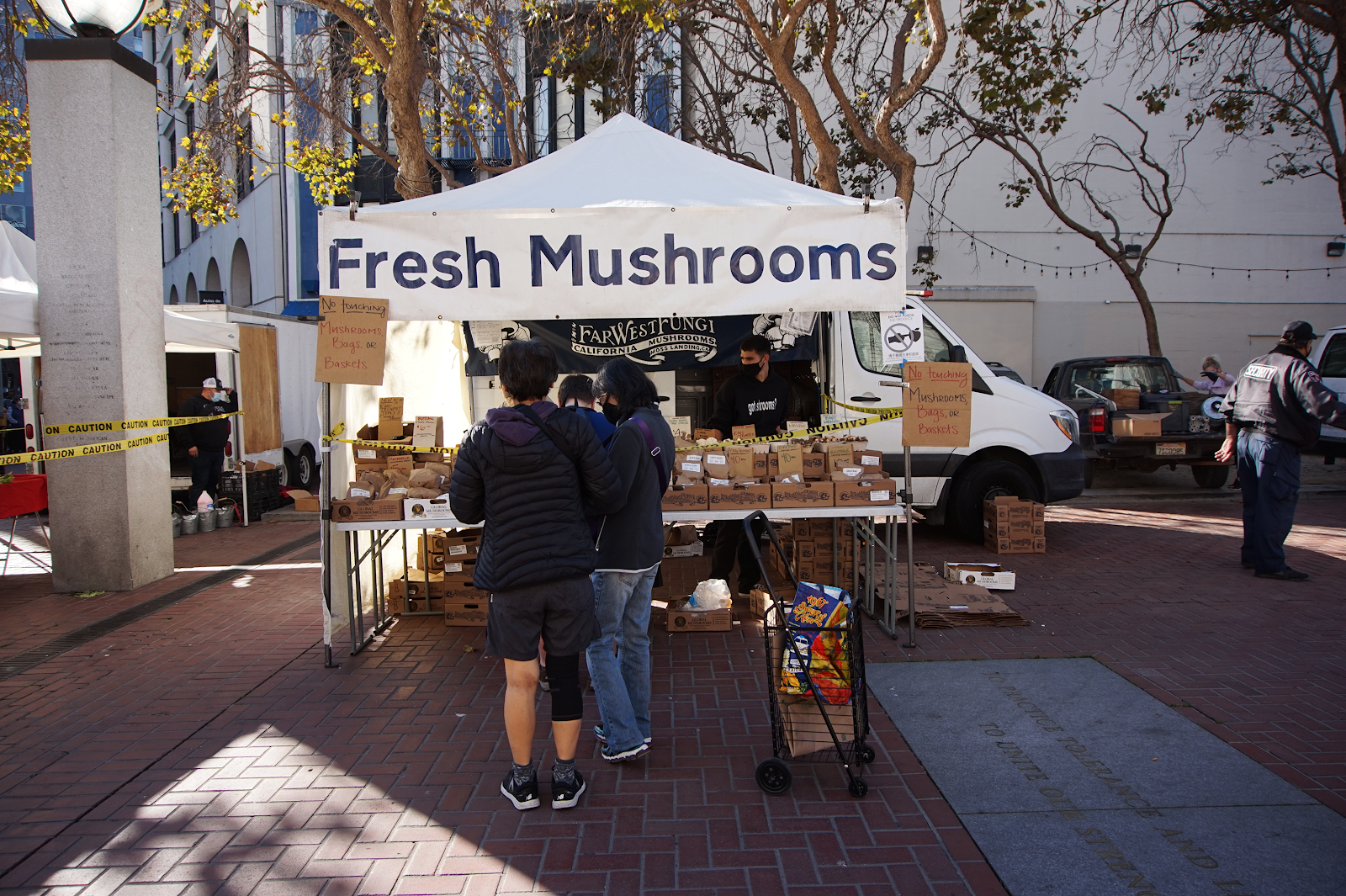 At Far West Fungi, a Bay-Area family-owned business that grows and sells mushrooms, additional staff are now sent to the stands to help with the transfer of food from the stand to the customer when a purchase is made. This is a new burden on the business and adds to concerns about their team’s safety and health. Sean Garrone, one of the four brothers who run the farm and a current Heart of the City board member, says that they’re taking all precautions, including gloves, masks, and social distancing.