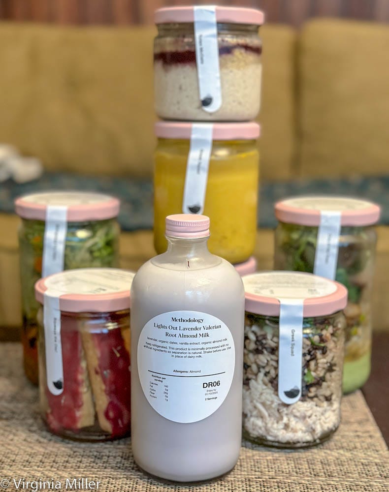 Delivered in two size options via cute pink-topped jars with directions on the bottle cap, the meals mostly heat in microwave or stovetop in 5 minutes or less, using sustainably-sourced meat, seafood proteins, with a heavy (but not solely) vegan focus. Menus rotate weekly with all three main meals, snacks and drinks, like a nurturing nighttime lavender valerian root almond milk that aids in sleep.