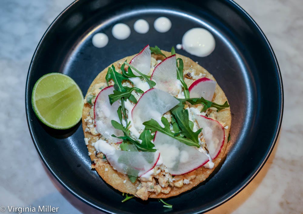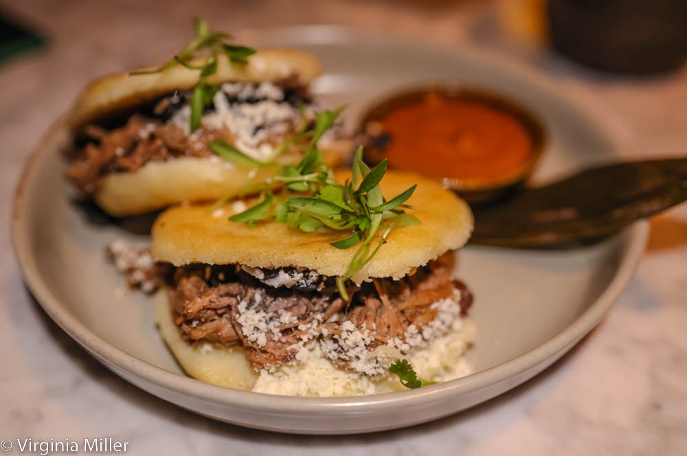 Maybe the best bite of the night was an esquites tostada: the crispy tortilla round layered with sweet corn in crema, crumbly queso fresco cheese, dried chiles and pico de gallo salsa. It captures the creaminess of classic Mexican esquites tempered by the tostada crunch. The other runner up is a spot-on arepas de pabellón, the national dish of Venezuela. The maize dough of the savory white corn “cakes” cradle brisket stew, black beans, peppers and cotija cheese in a little sandwich where the arepa itself outshines the meat.