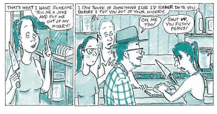 I bought the book on the description alone — it’s a graphic novel exploring the seedy world of sex, drugs, and cafe characters in ’70s Oakland — and read Over Easy in a day. It’s a tough book to put town. Pond immediately makes you a fan of Margaret, a kid full of self doubt and sardonic humor, whose mentor is the Imperial’s manager, a man who somehow has time for doing coke, raising kids, and spreading mass gossip about his employees’ incestuous relationships.