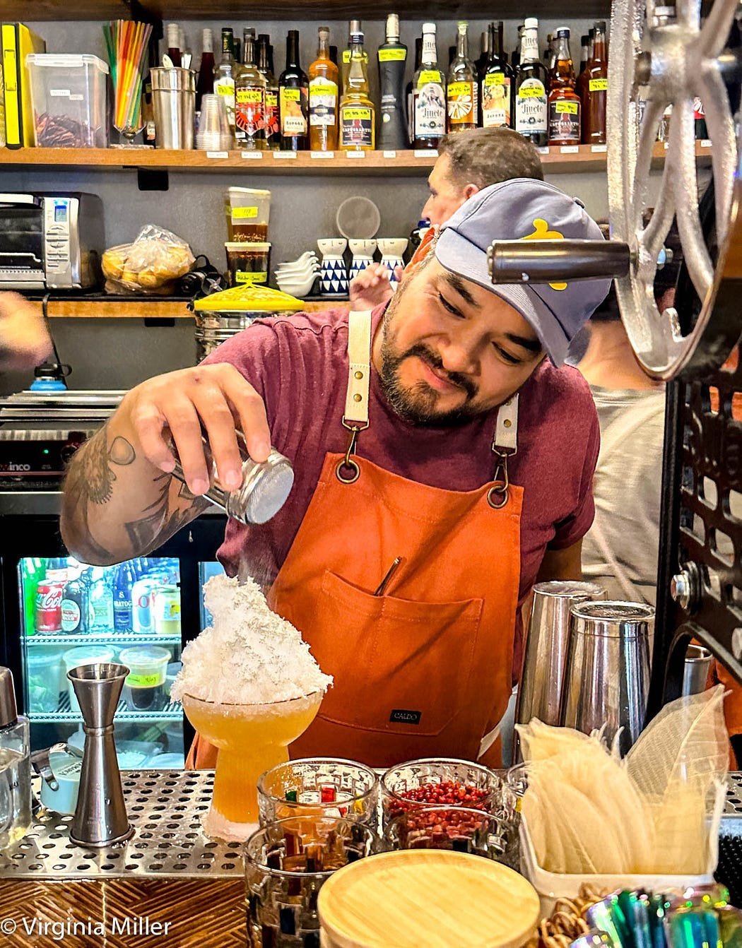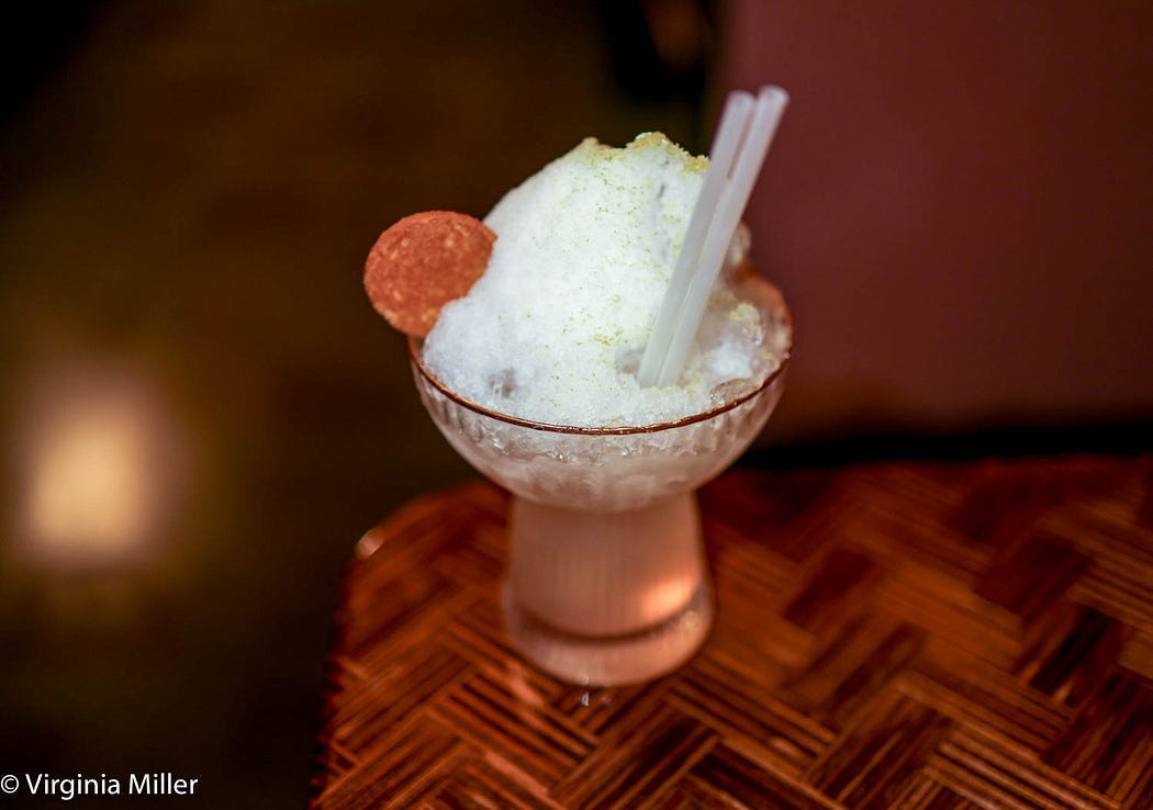 Key lime pie kakigori is my favorite of all the shaved ice options, being my favorite pie since childhood. Mejicanos nails it with tonka bean-infused low-proof vodka, key lime cordial, lime leaf aperitif, salted vanilla orange bitters, a coconut spirit, garnished with Nilla Wafers and lime “dust.”