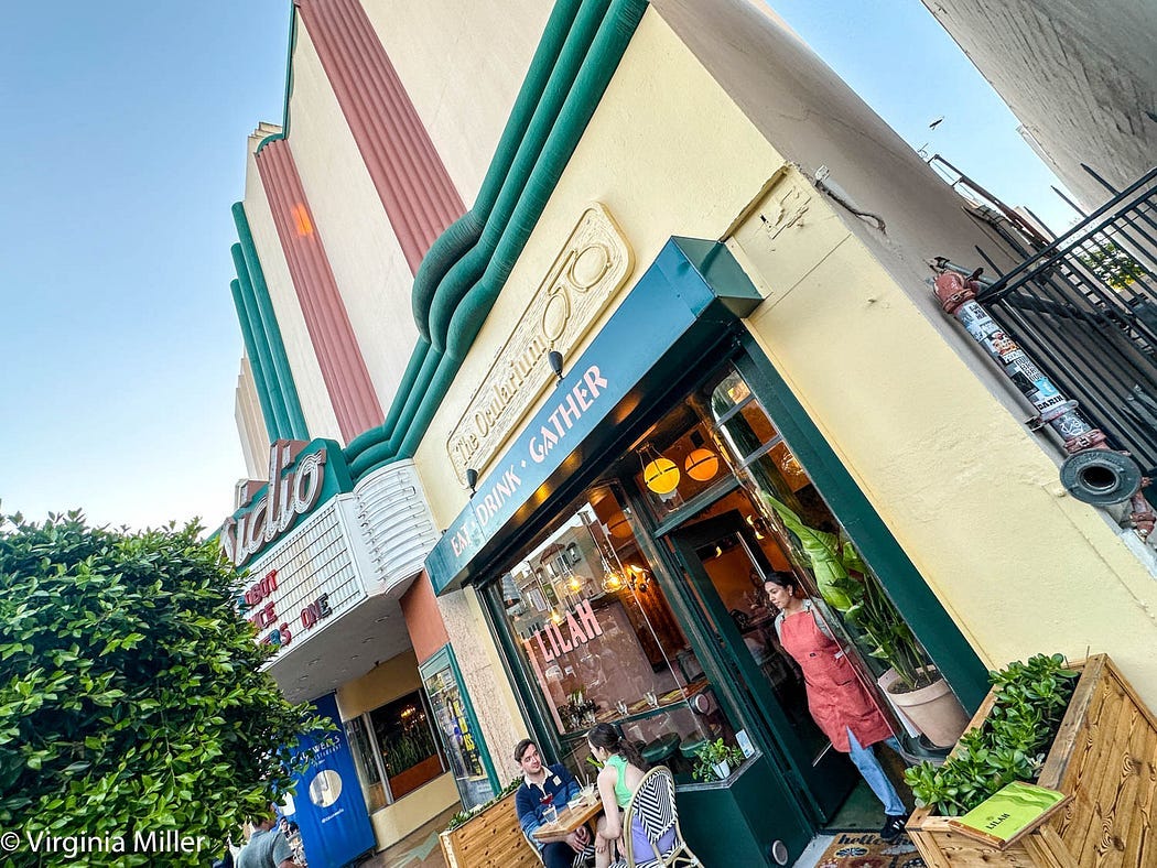 But first, Lilah’s design grabs you. The former eyeglass store is now a small but lofty space of rosy peach, patterned woods, greenery, animals drinking at a bar wallpaper, bird-shaped wall sconces, a couple outdoor tables and an exterior that matches neighboring 1937 art deco Presidio Theatre.