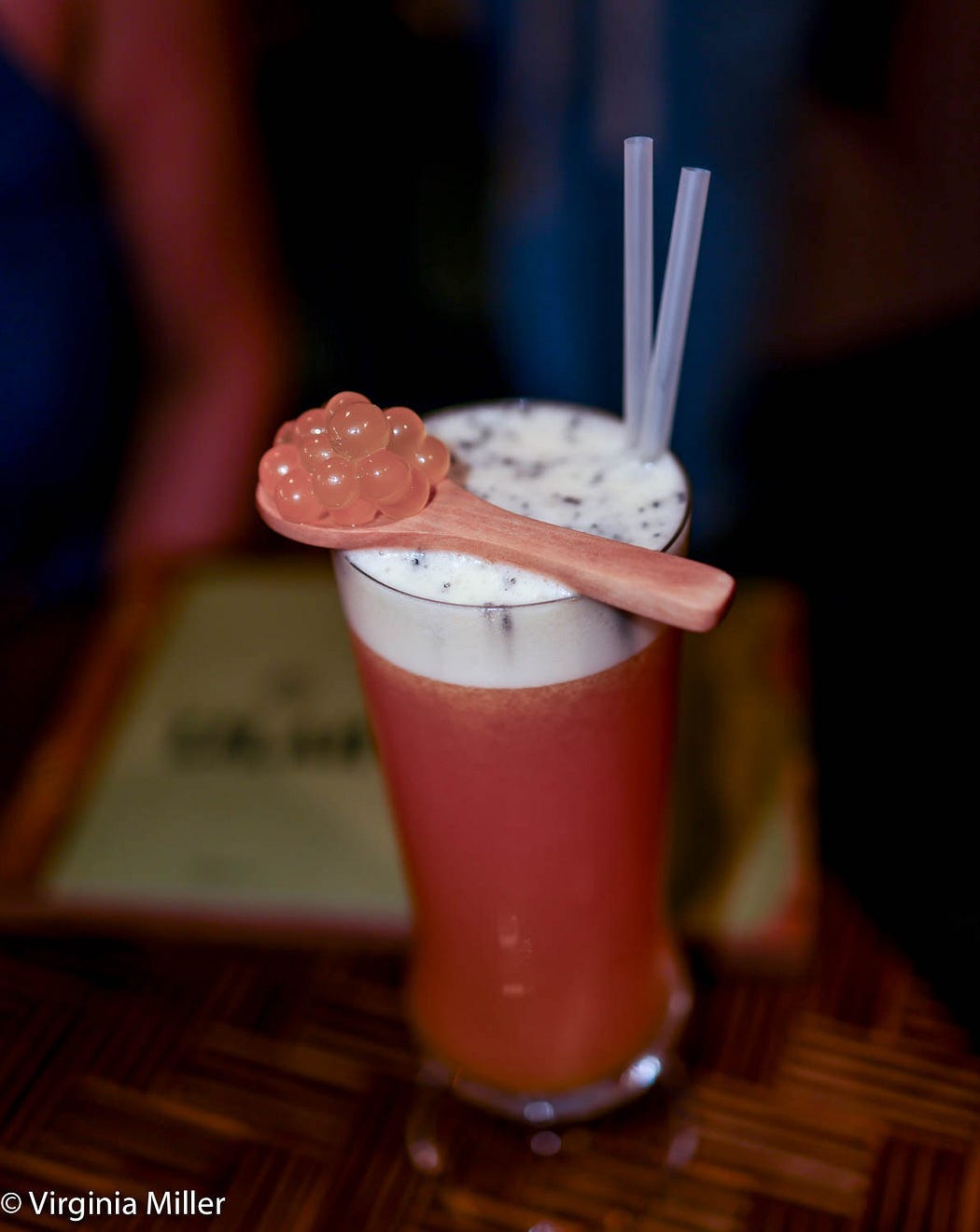 Pho Margarita is one of my top two. Aji amarillo-infused (Peruvian yellow chili pepper) “tequila” is mixed with cilantro, Thai basil, mint, star anise, cinnamon, agave, lime and egg white. It’s silky, savory, herbaceous and refreshing simultaneously.