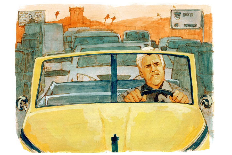 Living in Los Angeles means crawling through ceaseless, inescapable traffic — the kind that’s inspired millions of rushed apologies and commiserating conversations. Passing the time by singing along to Top 40 or rapping along to old-school hip-hop or talking via Bluetooth about work during nonwork hours. Laughing at the sight of an exasperated Jay Leno as he impotently stands alongside his broken down 1930 Duesenberg SJ during rush hour on the I-5.