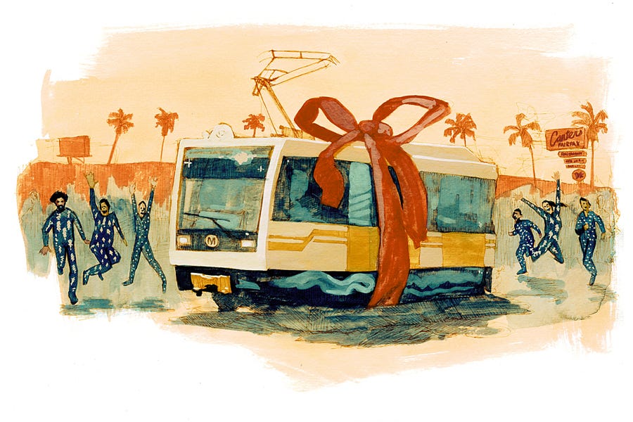 Living in Los Angeles means going home for the holidays. The years you don’t go home, it means eating Chinese food and marveling at the majesty that is an uncongested highway. It means wishing every day was a holiday or, at the very least, that the city had a decent public transportation system, which would certainly clear up the congestion. Being comforted by the thought that, one day soon, this hope will become a reality.