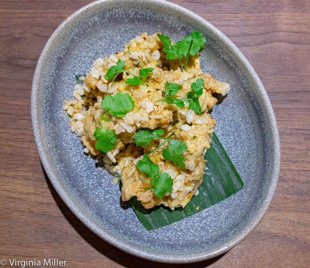 When it comes to ubiquitous Singaporean/Malaysian laksa, the beloved spicy noodle dish with different styles across Southeast Asia, I’ve tasted versions that made a deeper impact. Certainly in Singapore or locally from chef Nora Haron-Dunning when Local Kitchen featured her Singaporean dishes (Local is now back to a very typical menu). Damansara’s two-day-cooked broth of fish and chicken stock is made with over 24 ingredients, laden with shrimp, chicken, coconut milk, spices, herbs, puffed tofu, boiled egg and vegetables. I was searching for heat and bold flavor in the muted broth (of note, there is a vegan laksa with a broth base of kelp and mushroom, which I didn’t try). The huge portion of laksa felt prohibitive: the only option is a large $24.50 bowl, which we could barely eat half of for two. Oddly short on broth, our leftovers were mostly noodles (the option for a single serving size would be far preferable, especially to try more dishes vs. having extra of what ended up being our least favorite dish).