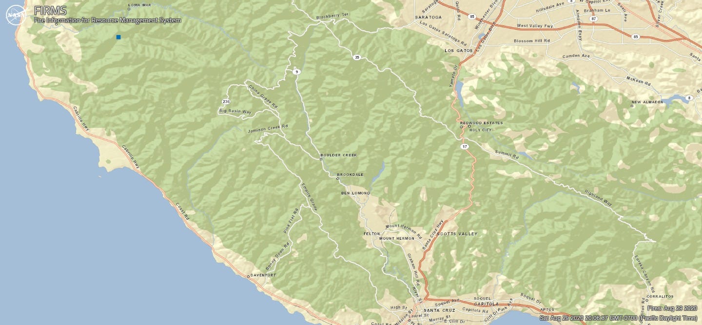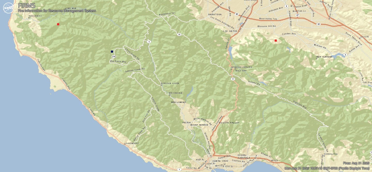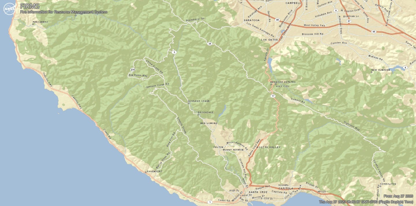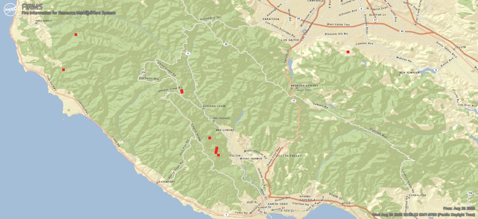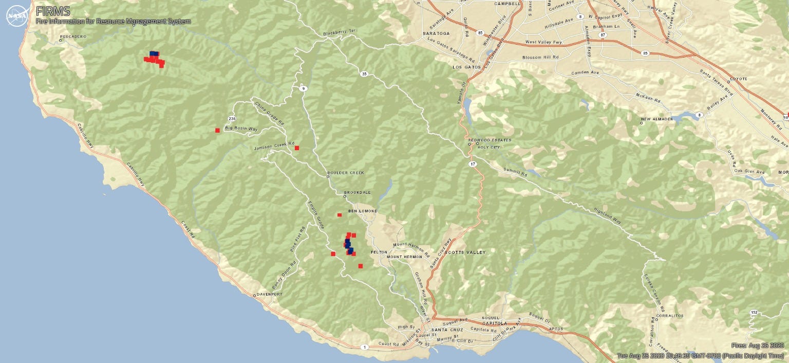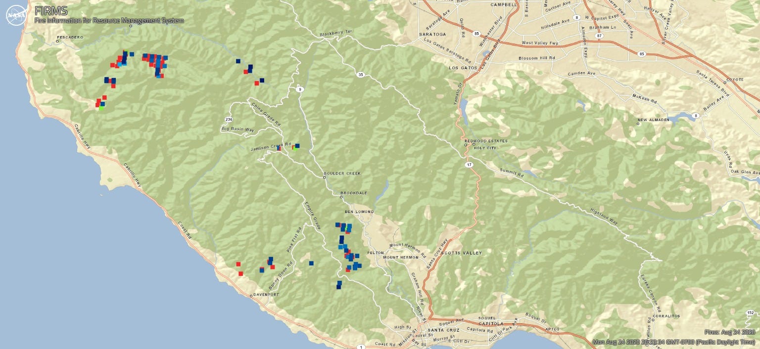 As dozens of fires continue to blaze across Northern California, I’m grateful for helpful maps and materials posted to Twitter and 95033talk to give insight into where the flames are heading. But I wanted more detailed maps, so I’m sharing this map series of the CZU Lightning Complex Fires generated using NASA FIRMS, which is operated by the NASA/Goddard Space Flight Center Earth Science Data and Information System (ESDIS) project.
