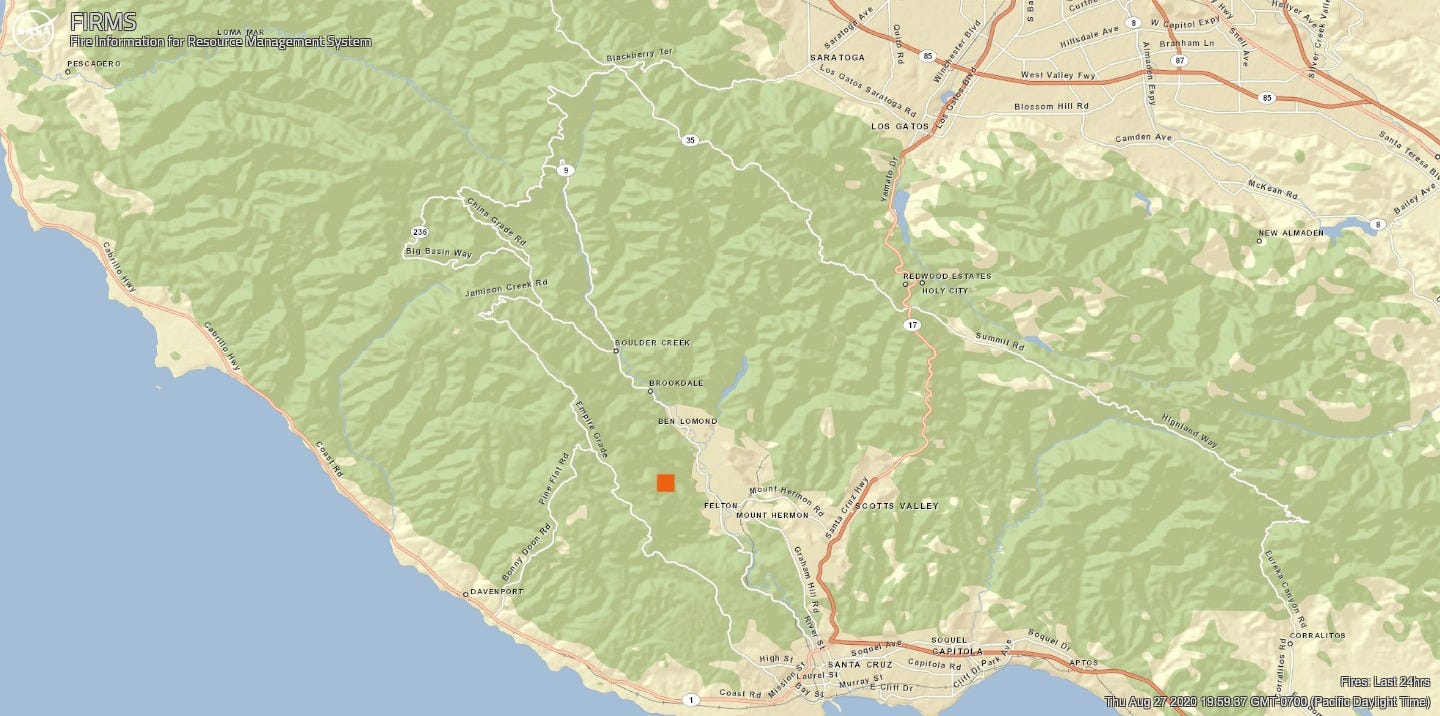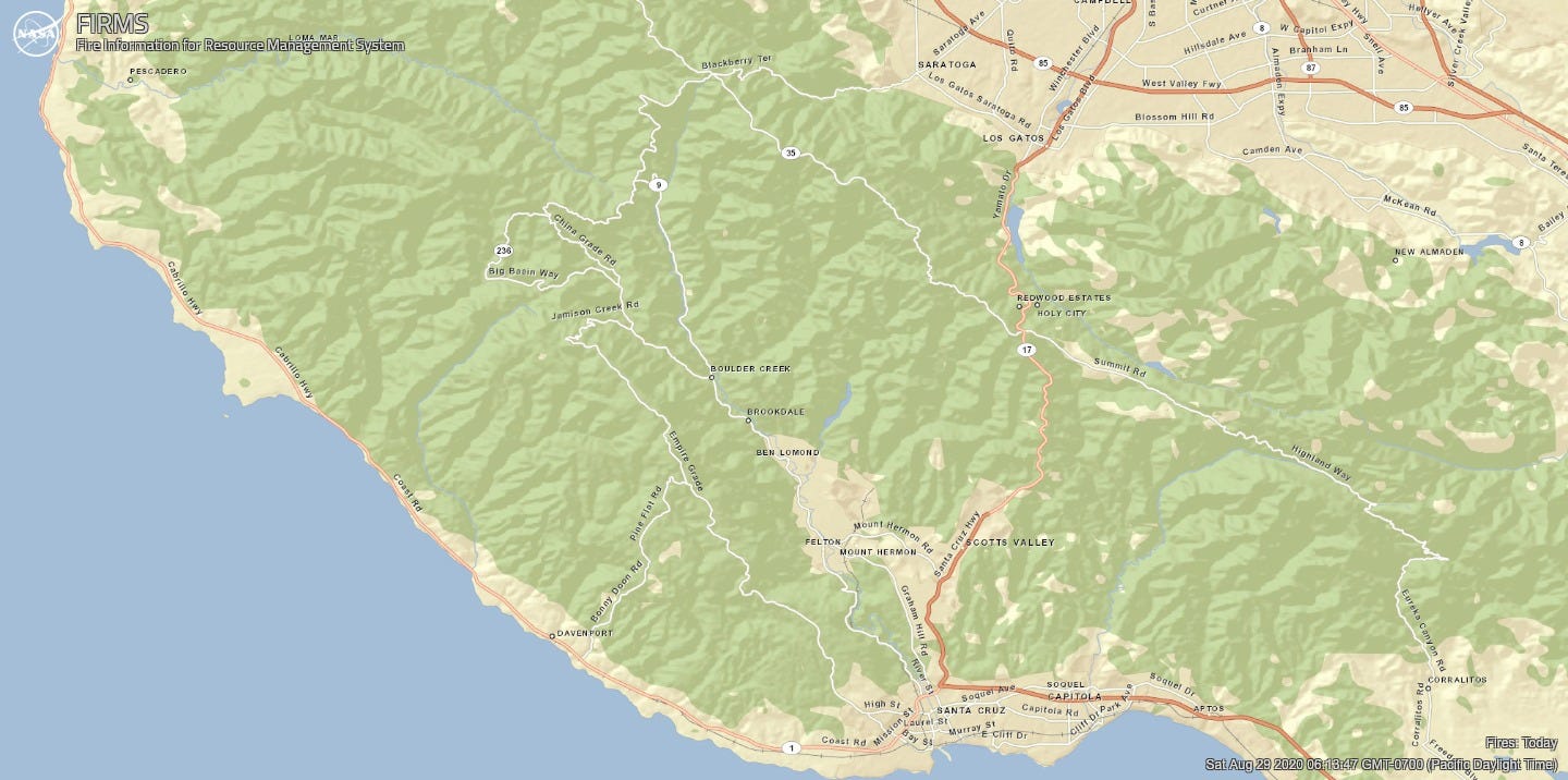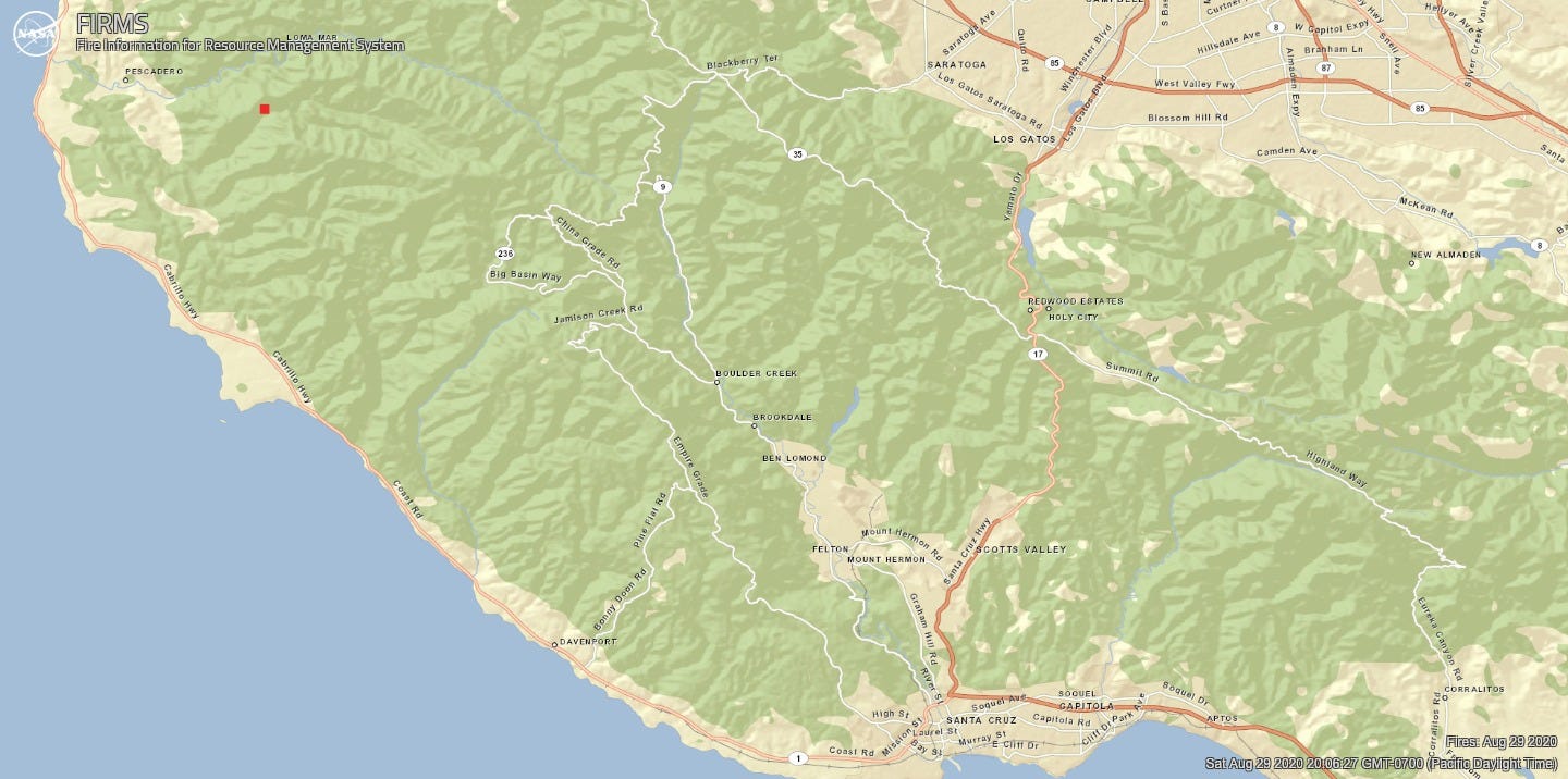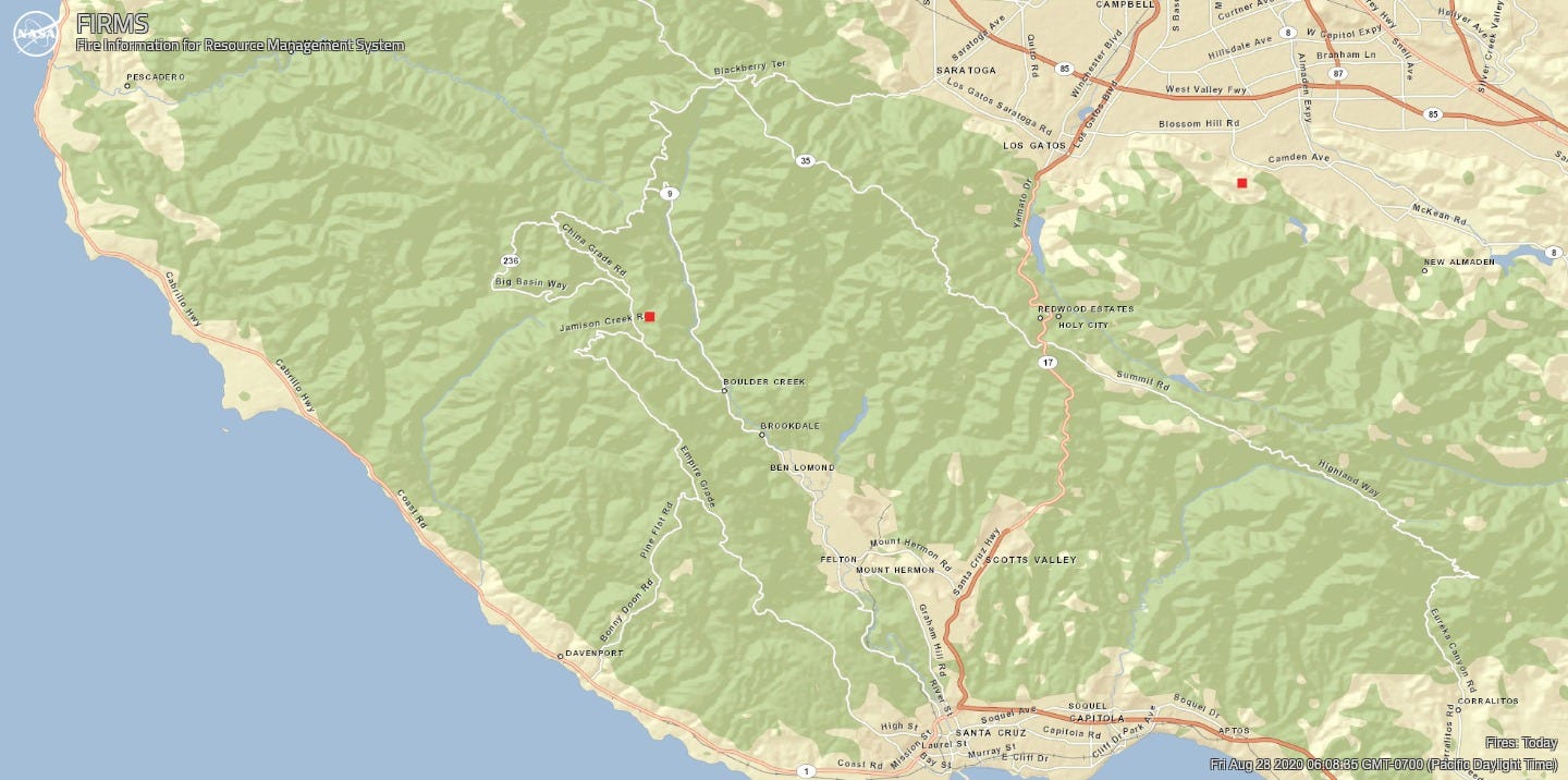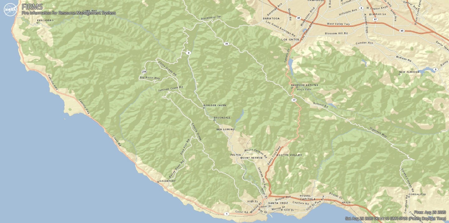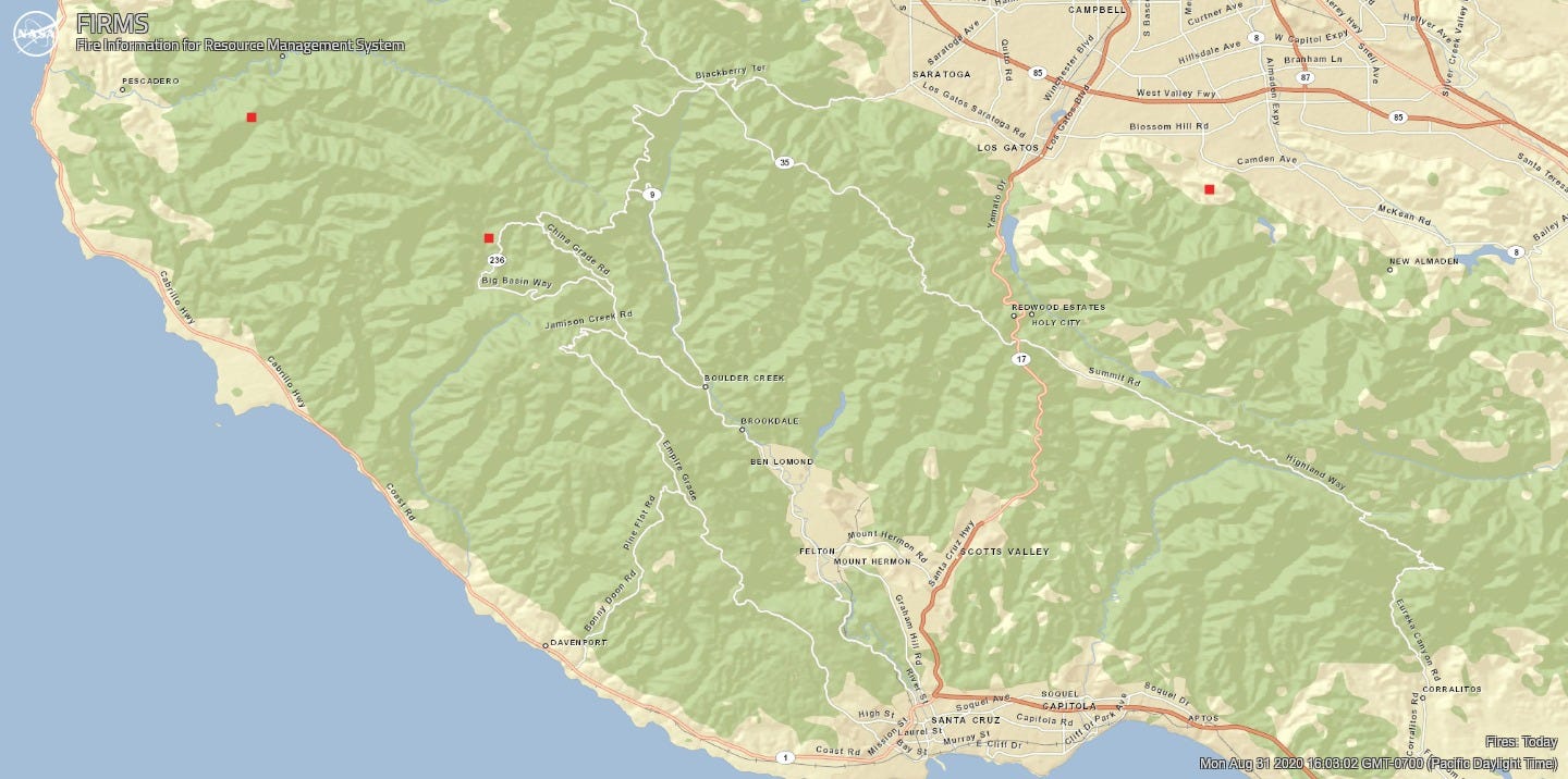 As dozens of fires continue to blaze across Northern California, I’m grateful for helpful maps and materials posted to Twitter and 95033talk to give insight into where the flames are heading. But I wanted more detailed maps, so I’m sharing this map series of the CZU Lightning Complex Fires generated using NASA FIRMS, which is operated by the NASA/Goddard Space Flight Center Earth Science Data and Information System (ESDIS) project.