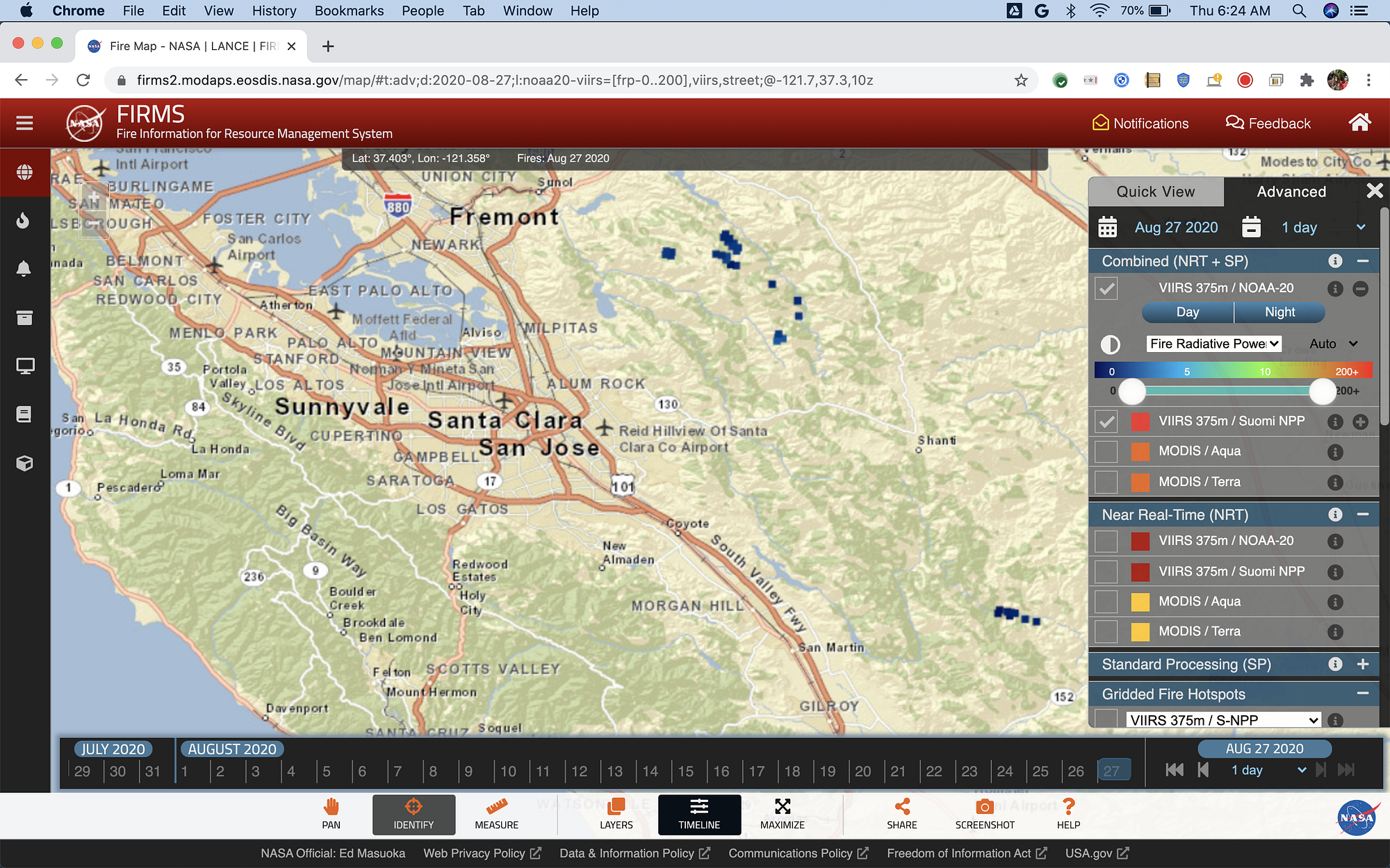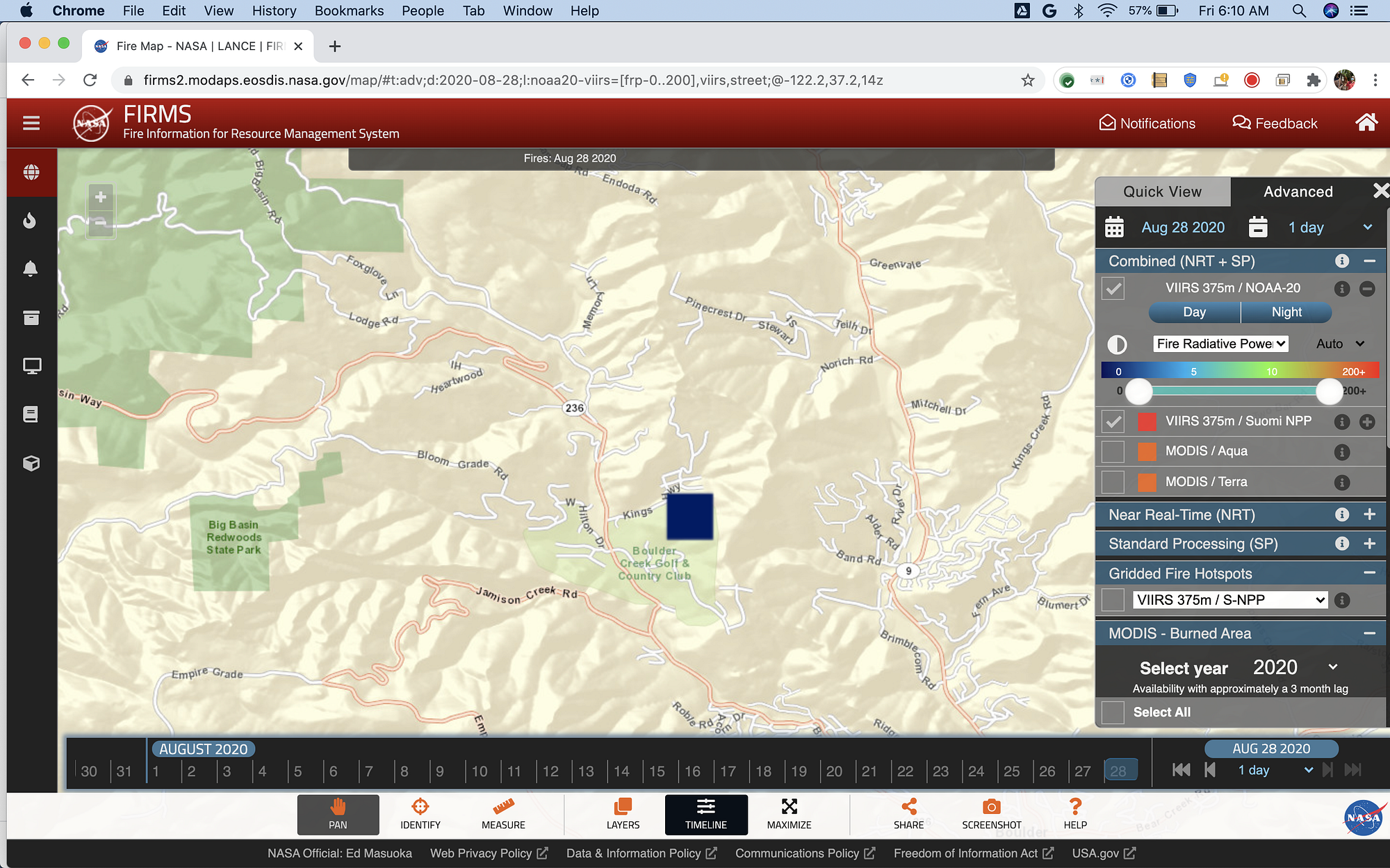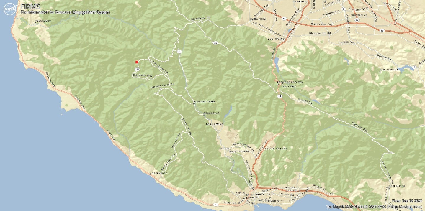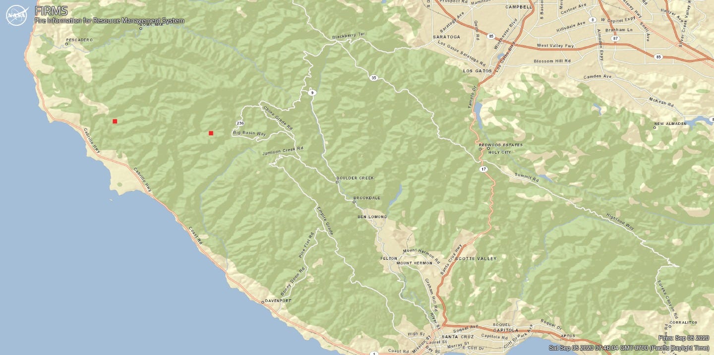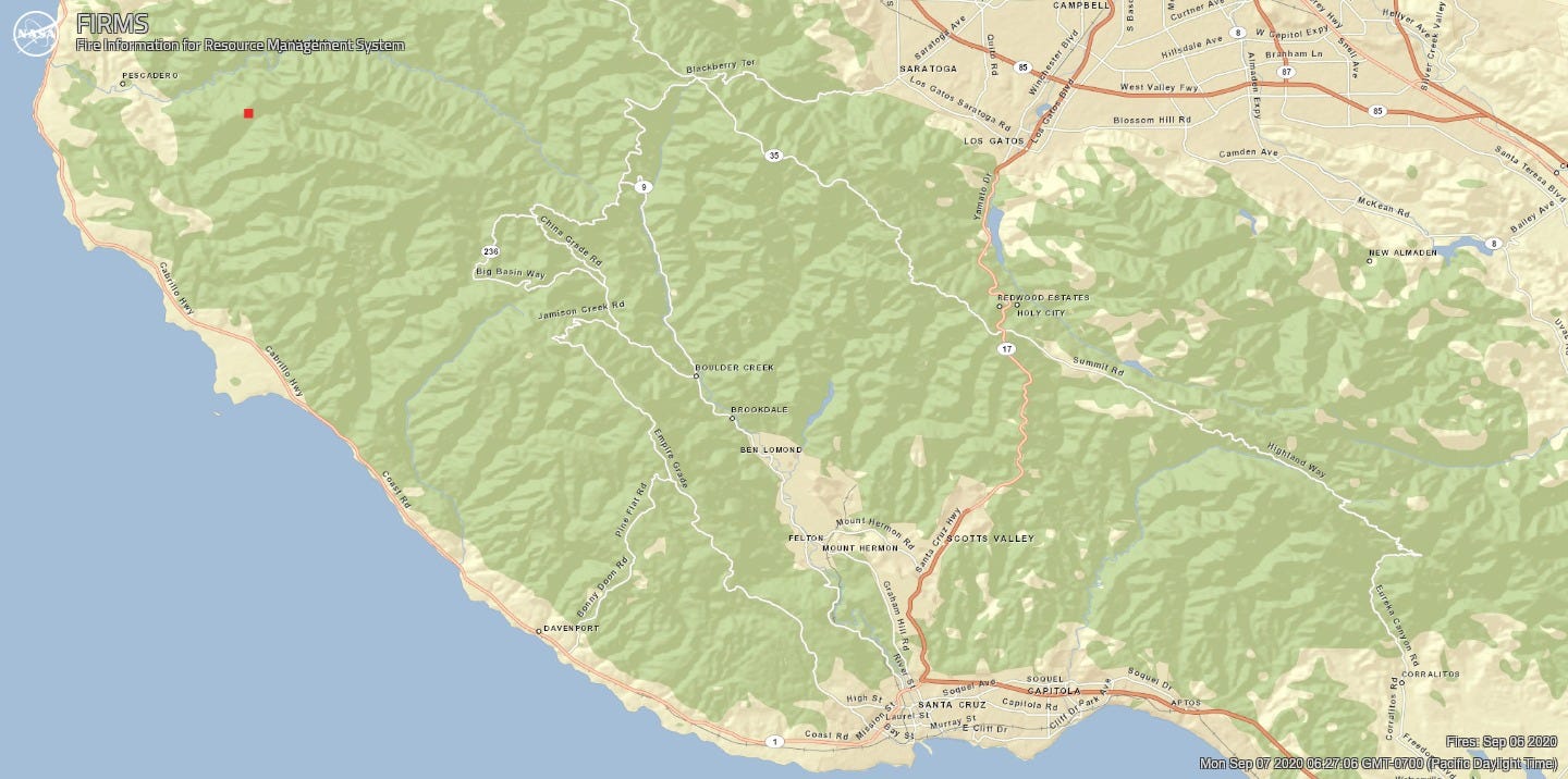As dozens of fires continue to blaze across Northern California, I’m grateful for helpful maps and materials posted to Twitter and 95033talk to give insight into where the flames are heading. But I wanted more detailed maps, so I’m sharing this map series of the CZU Lightning Complex Fires generated using NASA FIRMS, which is operated by the NASA/Goddard Space Flight Center Earth Science Data and Information System (ESDIS) project.