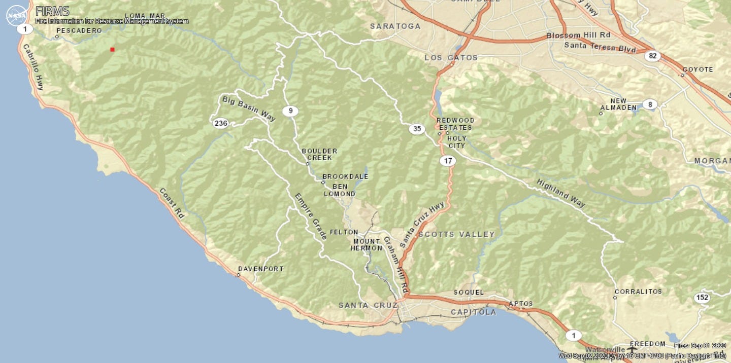 On August 30, satellite captures at 2:24 AM, 3:12 AM and 4:00 AM Pacific did not detect fire in the CZU Complex. On August 31 they detected two hotspots, one north of Butano State Park at 2:54 AM and another at 3:42 AM between N. Escape Road and Big Basin Way. No hotspots were detected the morning of September 1, with satellite captures at 2:36 AM and 3:24 AM. One hotspot north of Butano was captured at 1:54 PM Pacific.