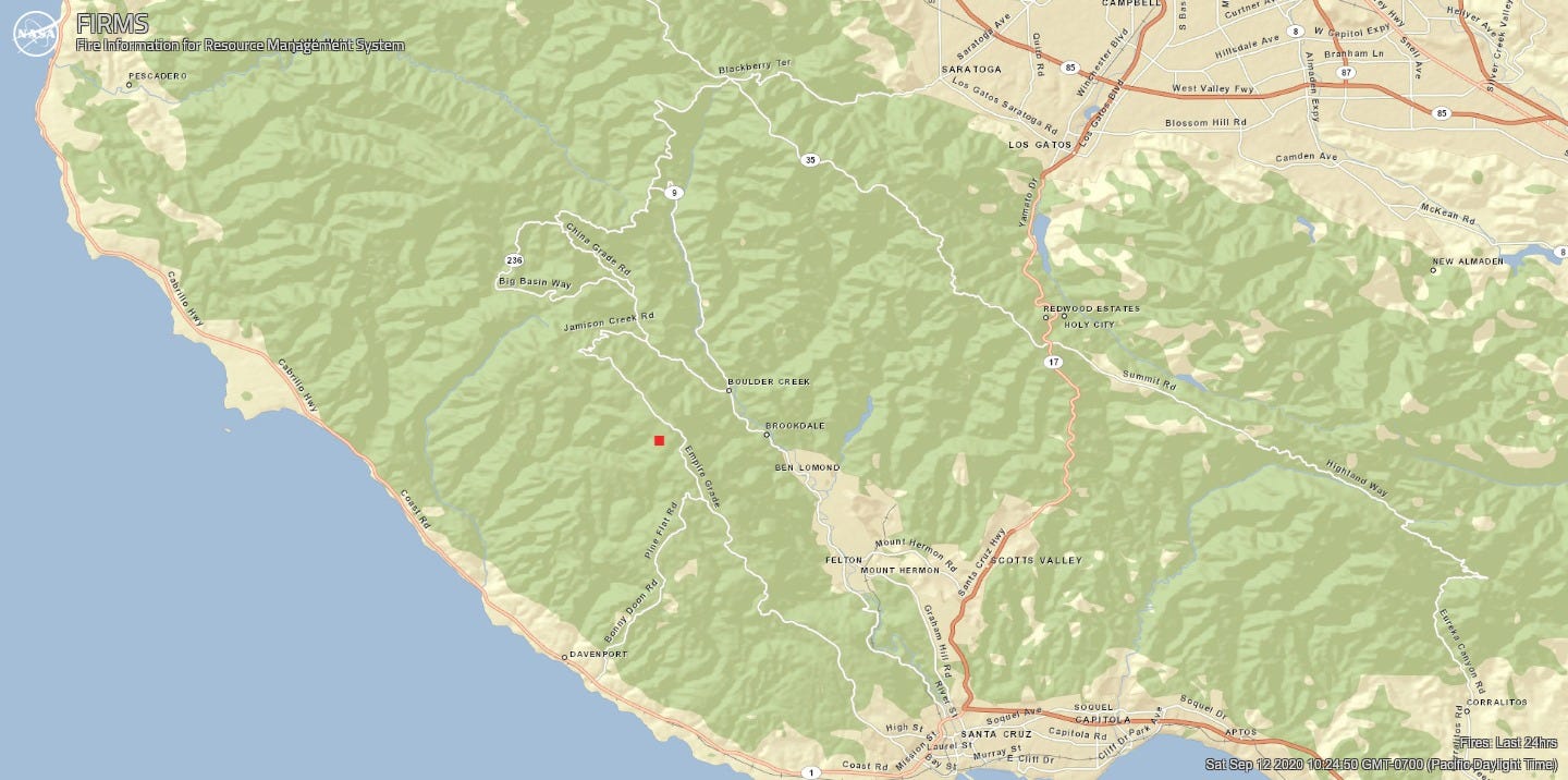 No hotspots were captured on 9, 10 or 11 September, but on 12 September the VIIRS system captured a hotspot at 3:18AM Pacific near the intersection of Empire Grade and Alba Road.