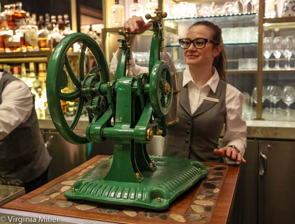 But the draw since February 14, 2023, is The Lounge’s new cocktail menu inspired by the Louis Vuitton Guide of global cities. The hand-sketched menu of cocktails are named after SF neighborhoods, artfully drawn and lovingly tributed by the kind Ritz-Carlton team, including F&B manager Daniel Delgado and bartender Jennifer Fairholm. Fairholm has given great service my two visits since pandemic and really cares about cocktails (she also demoed their nineteenth-century-inspired, green Imperial Shaker as I tried the shaken martini).