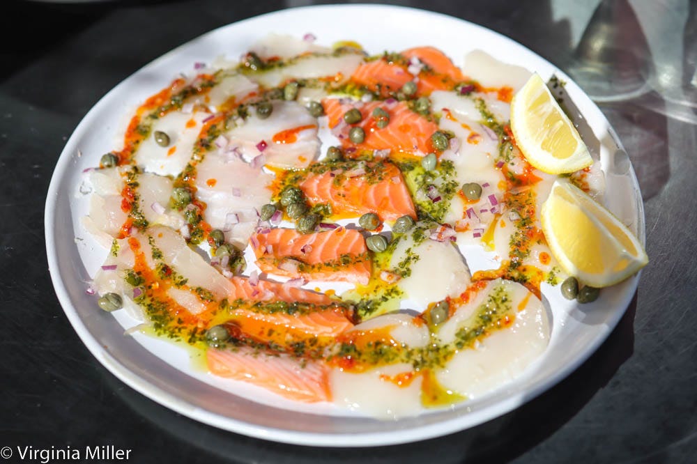 Pasta is one of the highlights. It’s not the most delicate, dissolve-in-your-mouth, ultimate Italy perfection common around SF from Flour+Water to SPQR. But it does taste like “real deal” neighborhood restaurants in Italia with a welcome 12 different pasta dishes. Bucatini sea urchin is lush in Calabrian chile oil, cream and, of course, uni/urchin. Ravioli con aragosta of lobster-prawn-stuffed ravioli in tomato cream brandy sauce is a highlight, reminding me of East Coast days. Ditto their silky crudo Calabrese — I tried the combo of raw halibut, scallops and salmon with capers and chili but you can order each individually (scallops were my fave), reminding me of the Sicilian sashimi at my beloved, the one-and-only Swan Oyster Depot.