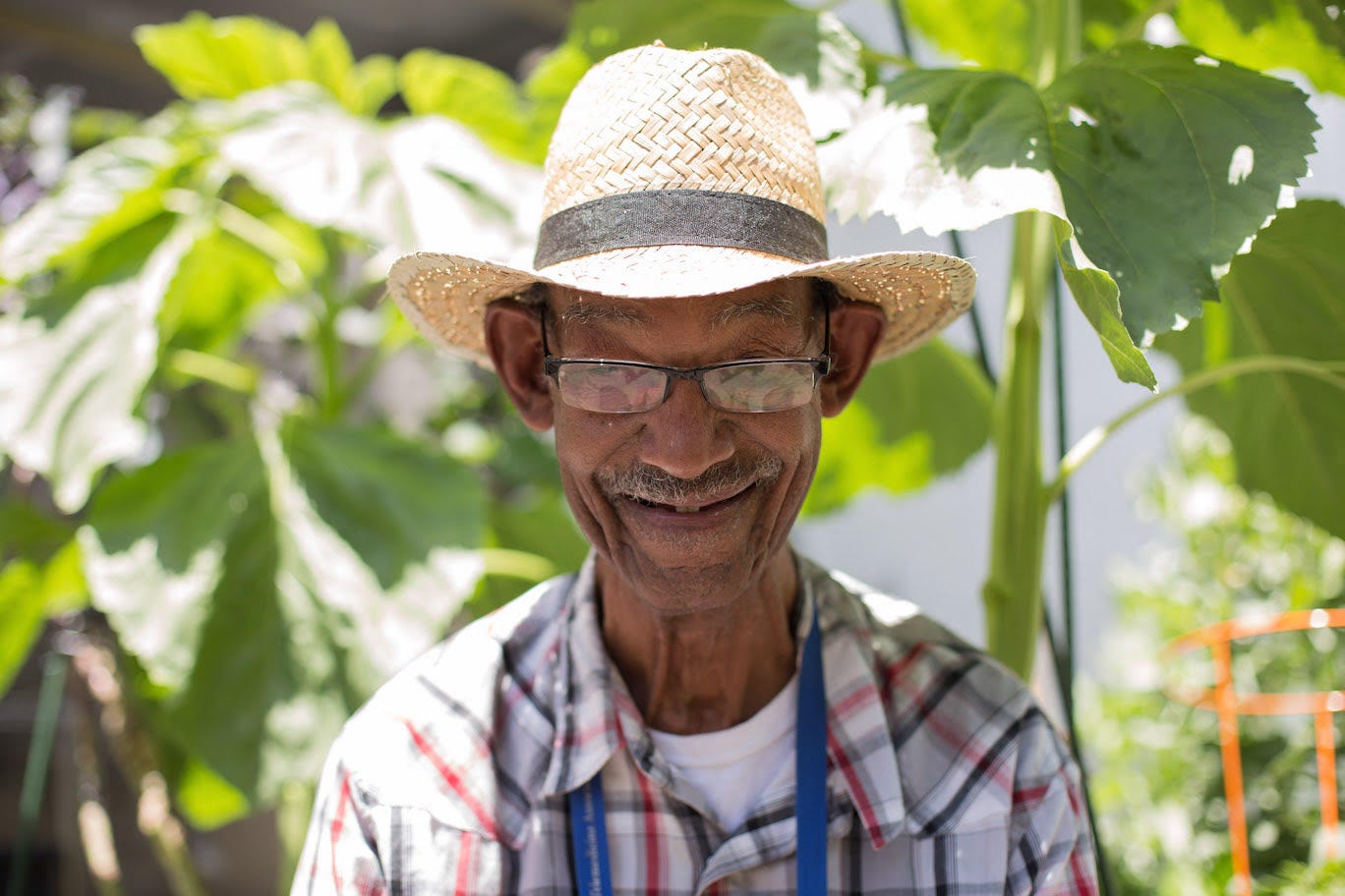 Lunch is served from 11:15 a.m. to 12:30 p.m. There’s a fluid and efficient order to the operations. Through an opening into the kitchen, the staff puts out each part of the meal. Volunteers seat guests, push cafeteria trays down the line, serve and repeat. Monroe is especially pleased when fish is on the menu. Tilapia, he explains, is the cheapest — cheaper than catfish and salmon — and he has a recipe for passion-fruit-glazed fish. After lunch, Monroe stays for bingo or activities like arts and crafts before spending three or four hours in the garden. “The garden is a sanctuary,” he tells me. “Sometimes I get in that garden, and I don’t know when to quit.”