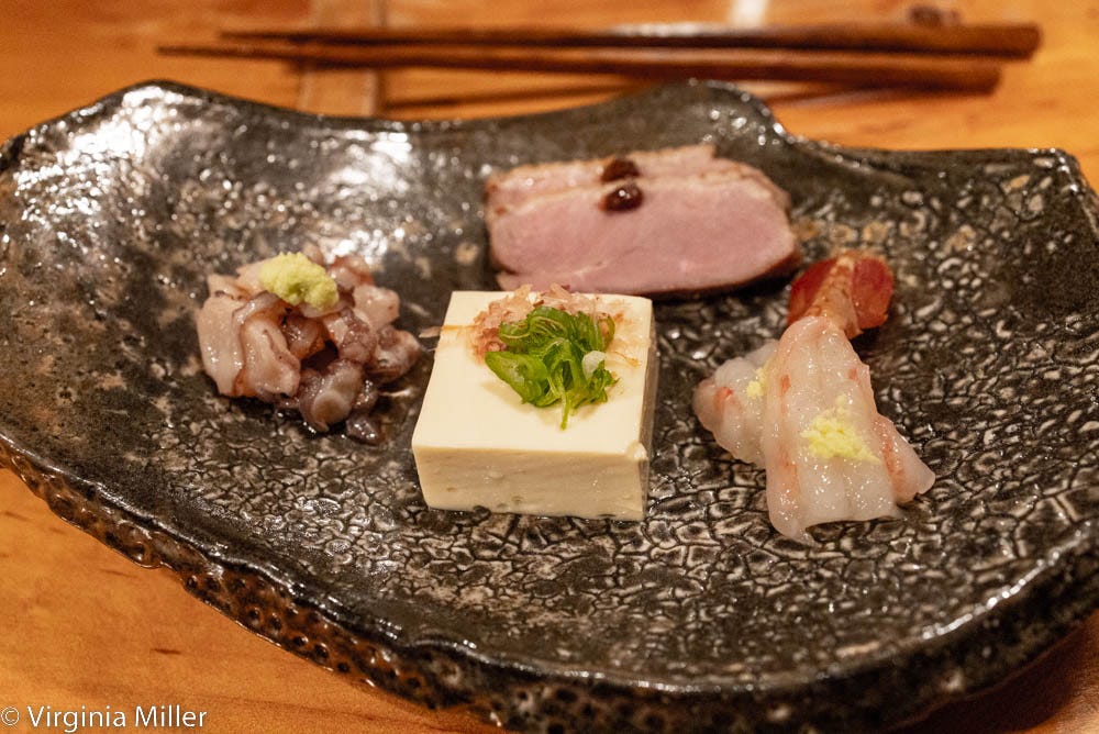 Gama’s sleek wood design and service could fit in at home in the City, even if some kinks reveal its small town nature: a key one was a mad rush of dishes all at once at the beginning. This is a real pet peeve as it means warm dishes grow cold while you try to taste quickly, and sashimi was thrown together with warm plates, a faux pas in Japanese cuisine. Especially after our server expressly said we could order one tasting menu/omakase (a reasonable $65 plus $35 sake pairings) and supplement with additional dishes, as we hoped to try a broader range and sample their typical omakase. Coursing out dishes should have happened here.
