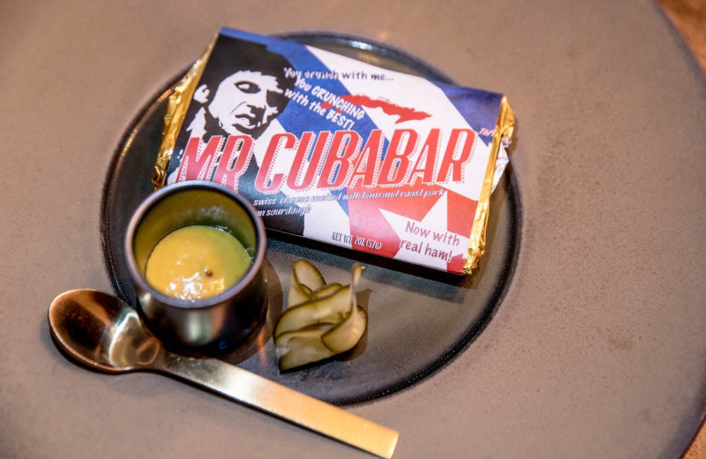 Prime example? Mr. Cuba Bar, a house-designed label sporting none other than Al Pacino in his Scarface Cuban era (“Now with real ham!”, the label reads). “Nutrition facts” on the back state “100% cigars, deliciousness, rumba and 0% facism” — everything but the cocaine, really. Inside the wrapper is a mini-Cubano sandwich of smoked pork shoulder, Iberico ham, Swiss cheese and pressed French bread in one flattened rectangle, partnered with vibrant mustard and pickles. Each steaming hot bite out of the wrapper might as well have been candy to savory-seekers like myself who believe the Cubano is one of the ultimate sandwiches. A savvy pairing of dry, savory MV Bodegas Osborne “Capuchino” Palo Cortado Sherry added more layers of flavor, sending it through the stratosphere.
