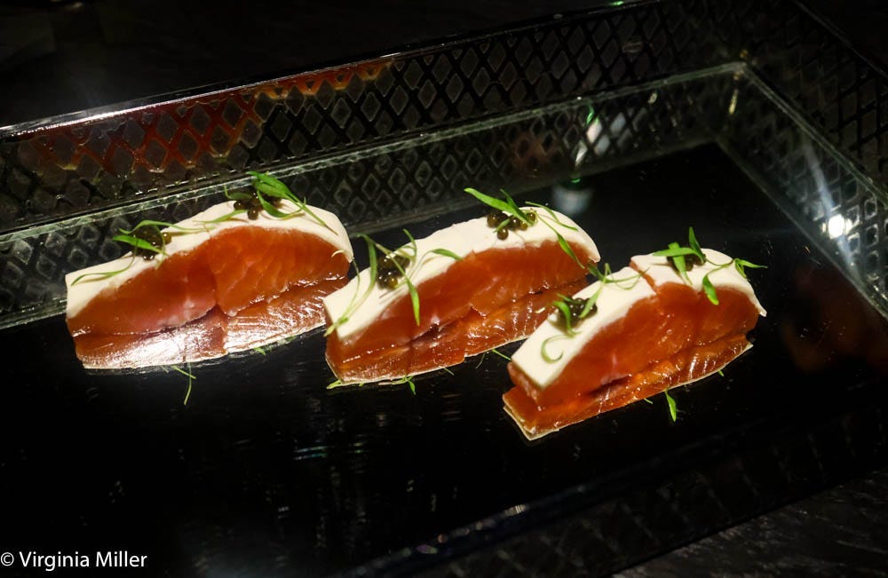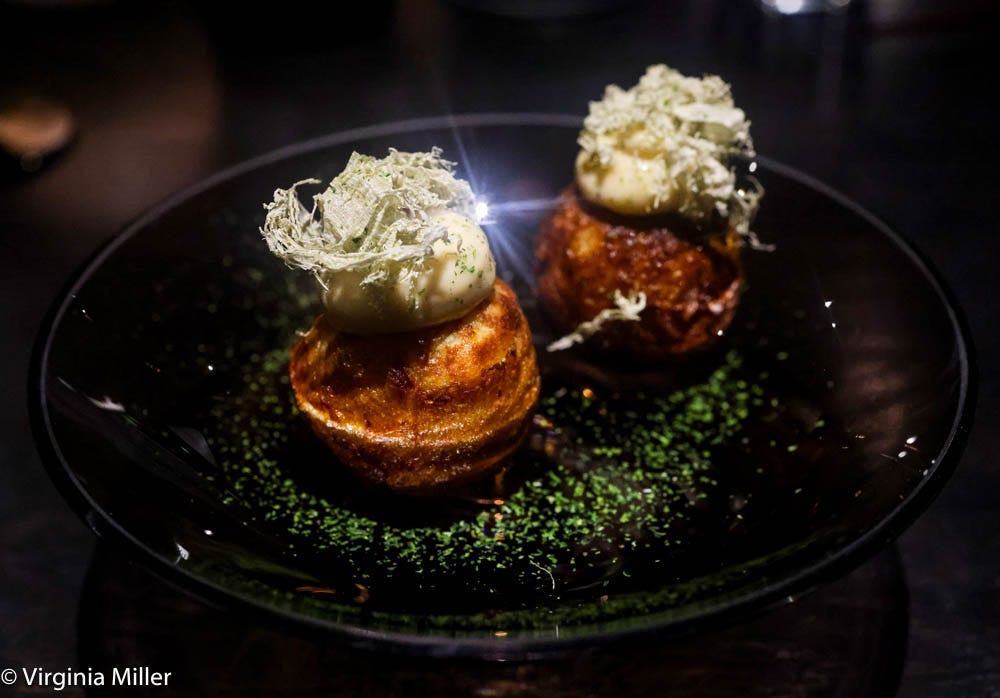 Ditto on killer caviar that’s served on a sweet potato pancake, savory-briny-sweet with nuts and buttered maple. But jamon Iberico fat-laden popcorn dusted in nori dried seaweed and onion could be a night on its own. Paired with champagne it’s the dream movie night or bar snack. Silky, cured Scottish river trout recalls Scotland via Scandinavia, with the fish cured in brown sugar and sea salt, in a creamy-white layer of horseradish creme fraiche marked by golden osetra caviar. All happiness.