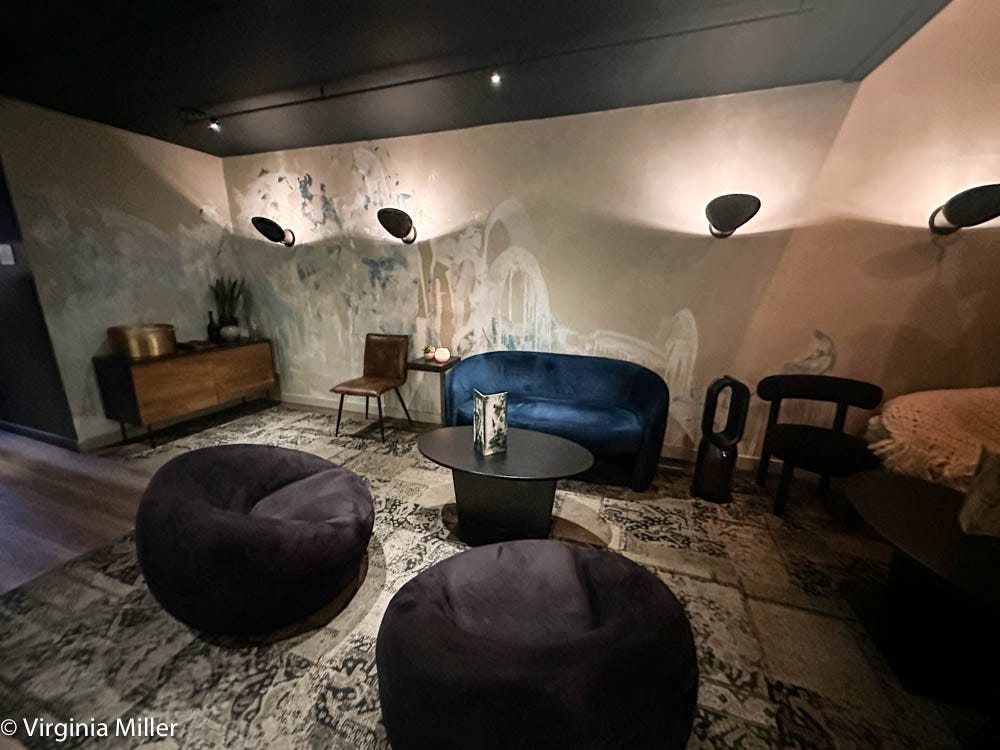 Velvet couches in red, royal blue and soft sky blue, comfy chairs, vinyl selection, mid-century tables, a couple corner booths and a beautifully gnarled Napa vine that Widger saved from being thrown away and is using as wall art, mark the intimate two floors. There’s a private dining room with records, a table and artful, circular wine cellar storage.