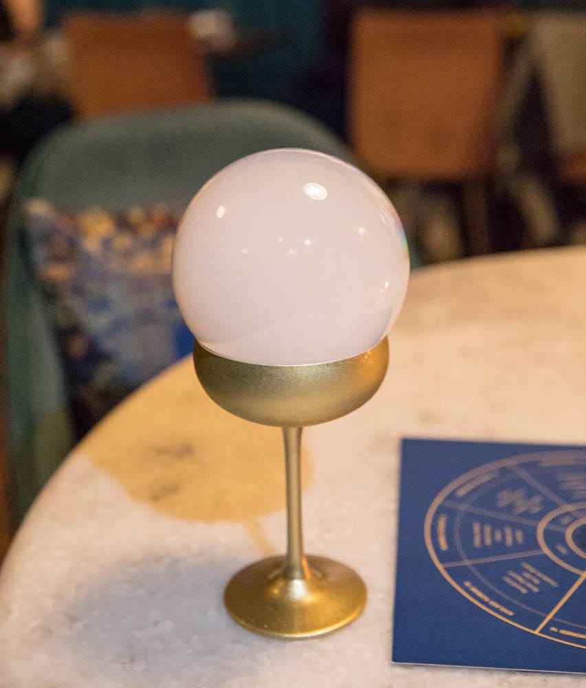 It’s a sophisticated sipper of Monkey Shoulder Blended Scotch with pineapple, thyme and Sauvignon Blanc reduction. Notably, it arrives molecular-style with a giant sphere atop the gold cocktail glass, waiting to be popped, dissipating into smoke, revealing the smoky pineapple elixir in the glass.