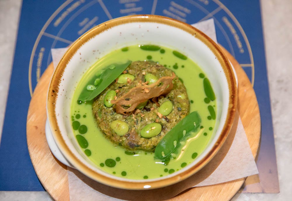 Sweet and savory often play on the menu. Take a generous, veggie-laden hara bhara kebab. Here, the traditional Indian spiced potato cake is packed with edamame and peas, with a sweet-tart hit of huckleberry. The dish is green and verdant, swimming in snow pea broth and nira oil (Japanese garlic chives). Though comfortingly, it tastes like spring.