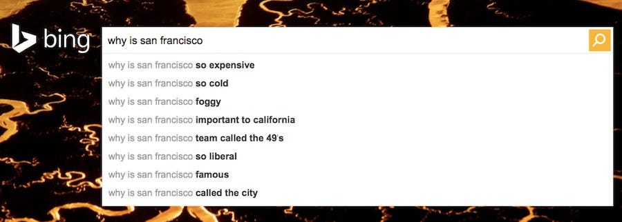 You may remember earlier this year when I took it upon myself to answer pressing San Francisco questions that the gaping maw of Google coughed up. Some readers called me a genius, some called me a saint, some called me the wisest journalistic voice of the generation. Actually those were just things that I said to myself in the mirror the other day, but still some of you liked that article. I decided to go back to the ever bountiful font of curiosity that is the internet — this time to Bing — to find more San Francisco questions to answer.