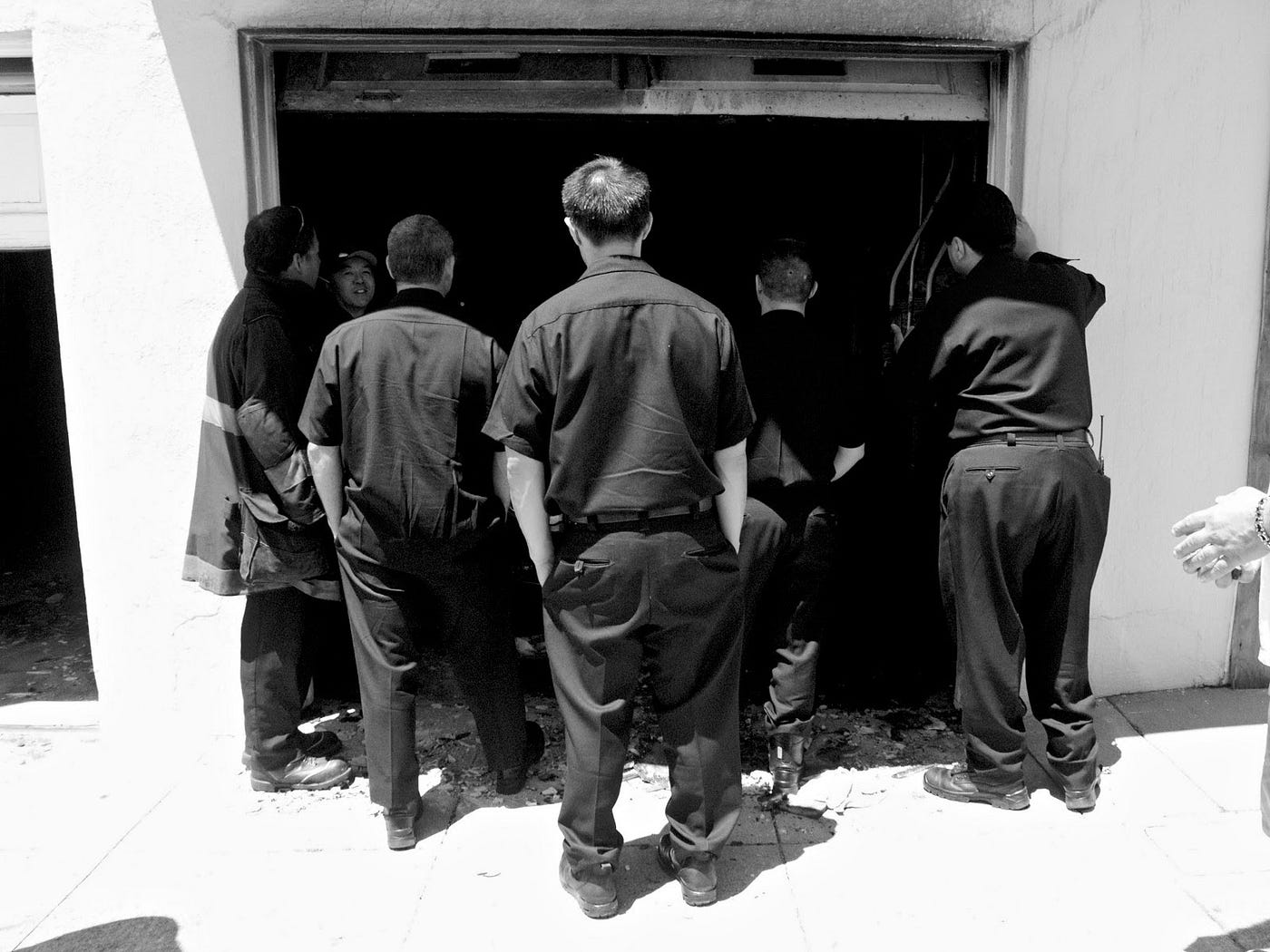 A group of firemen stood around his denuded BMW, casually talking. They let me walk through the building with them to assess the damage.