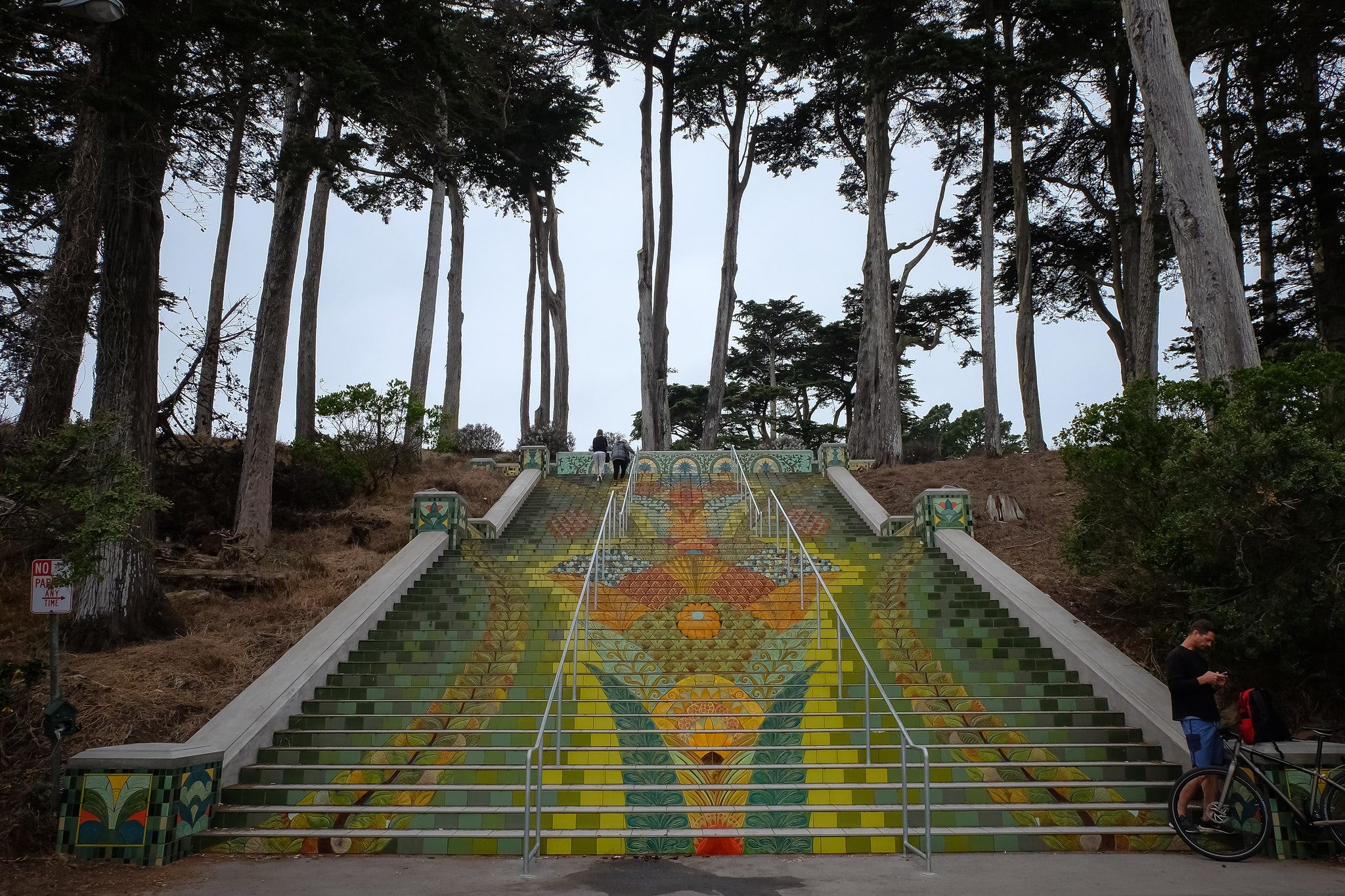 One day, finally, we reached the street’s summit. My daughter, then about two months old, slept peacefully in her stroller, and our dog, normally feisty on walks, became very calm. I looked up and saw that we had reached the end of the road: 32nd and California, and the Lincoln Park Steps, a giant, extra-wide staircase covered in mosaic tiles.