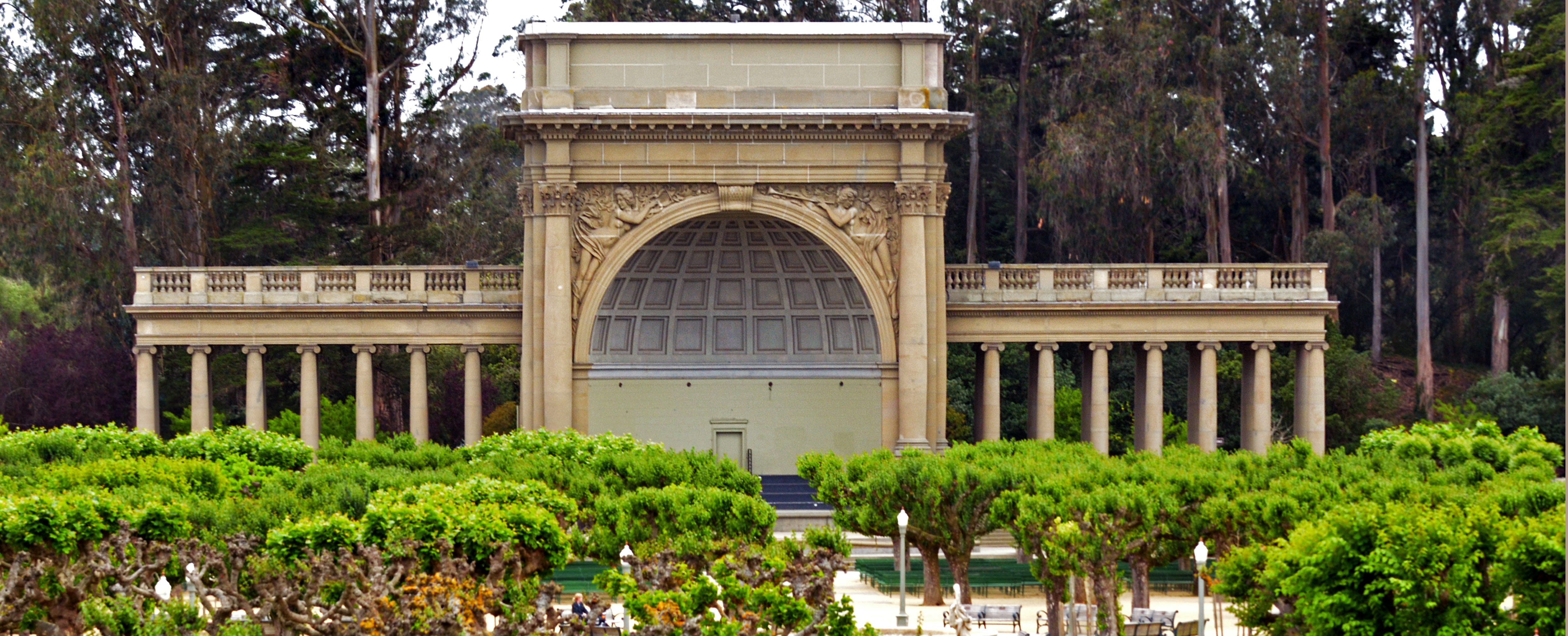 Originally excavated for the California Midwinter International Exposition of 1894, the concourse underwent a major redesign after the fair to be repurposed as a venue for public gatherings centered on music performances. The focal point of the plaza, Spreckels Temple of Music, also called the “Bandshell,” was a gift to the city from sugar magnate Claus Spreckels. The structure was built in 1899 and has undergone rounds of renovations, including after it was severely damaged in the 1906 and 1989 earthquakes. It has served as a stage for numerous performers over the years, including the Grateful Dead.