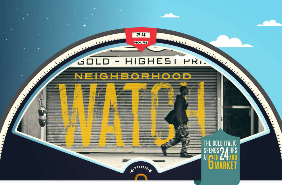 Sixth Street at Market is one of San Francisco’s most infamous intersections and one of its least understood. People from all walks of life cross paths here, but most don’t intermingle. The neighborhood is mostly known for its gritty liquor stores, strip clubs, and SROs, but the landscape is changing dramatically with pioneering restaurants, cutting edge galleries, and revitilization efforts taking hold. On Saturday, June 5th, to get a better sense of what the intersection is really like, locals from The Bold Italic decided to stay a while — for 24 hours in fact. They captured their experiences on video and in the vignettes below.