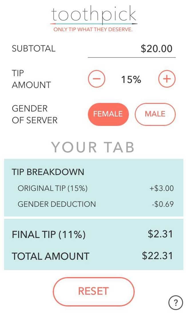 If you’re not familiar with the gender pay gap, a new app will help you figure out what it’s all about. It’s called Toothpick, and it instructs you to give a lower tip when your server is a woman.