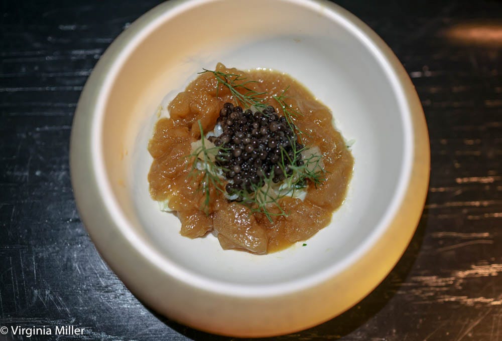 Beginning with kombu-cured kampachi crudo or a Dungeness crab and caviar, we chose one of each, naturally. The kampachi fish was lean and silky, swimming in nutty sesame dashi brightened up with yuzu citrus, a kick of horseradish and shiso Japanese mint oil. The crab is an umami bite over crab gelee, it’s bright moment being makrut lime. A $16 supplement of Baika caviar adds briny decadence, even if the slightly fishy note of the crab that night clashed just a touch with the caviar.