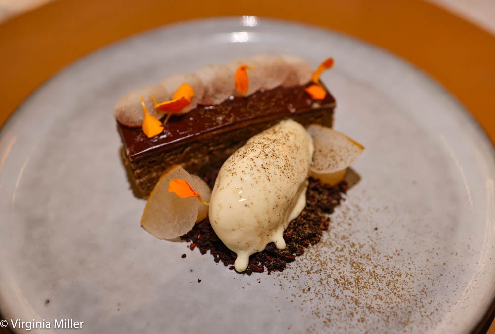 As expected with Serena’s pastry chef skills, dessert is a highlight here and features some of her new, locally made Jack & Remi ice cream line, reviewed here. On the initial menu, we tried one of each. Hoijicha opera sponge cake is layered with coffee butter cream and chocolate with compressed pear, tasting like winter. I especially loved her spiced apple crumb cake, also of the season with those gorgeous aforementioned Lucy Rose glow apples, satsuma citrus snow and herbaceous-citrusy Jack & Remi orange bay leaf ice cream.
