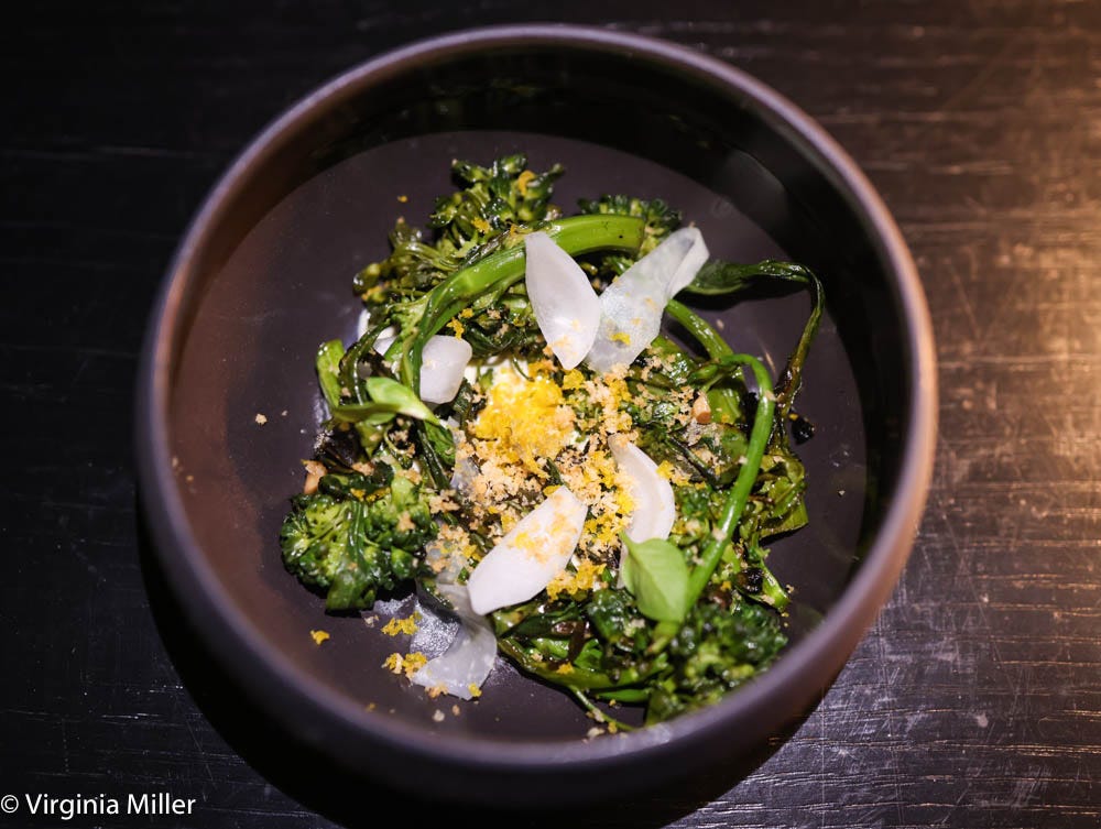 Charred broccoli di ciccio with pickled kolhrabi root and mullet roe came next, in a classic French gribiche: hard-boiled egg yolk, mustard, pickled cucumbers, capers, parsley sauce. The earthy char of the broccoli with oceanic whispers from the roe and perky pickled notes made this a standout despite being “just” the veggie course.