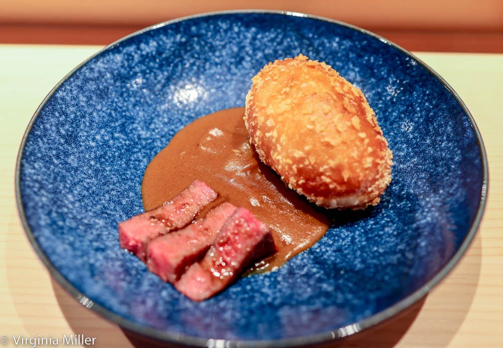 We were enjoying ourselves, for sure. But the course that came next took us higher. “Japanese Curry & Agepan” was A5 Wagyu striploin with a deep fried milkbread ‘donut’ in Japanese curry. Think your dream katsu sandwich flavors and the ultimate Japanese curry with the silkiest (and priciest) beef in the world: A5, complete with certificate from Japan.