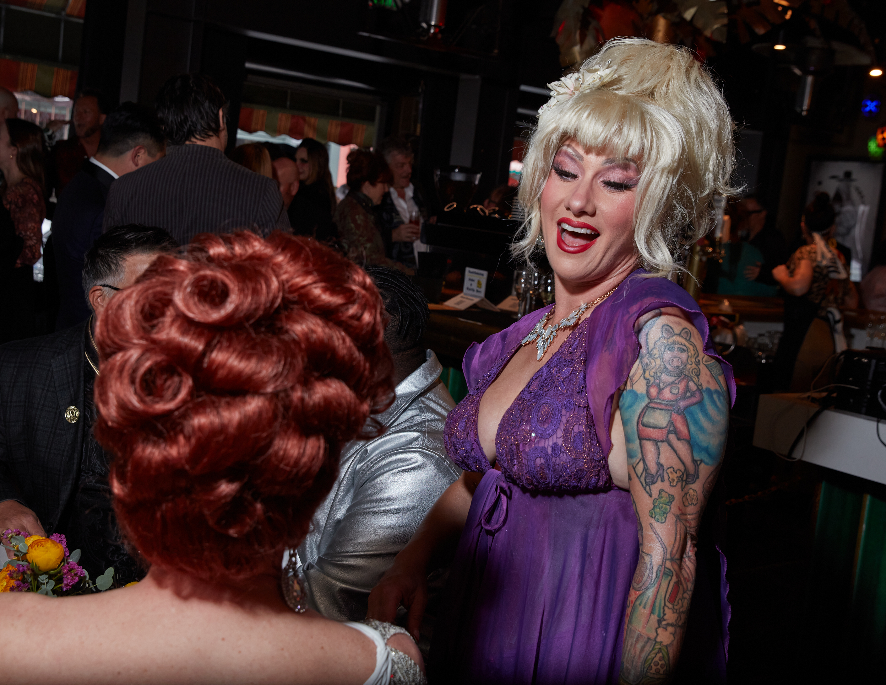 I’ll add that San Francisco does fine with fashion, but I wish soirées like these happened more often. I’m all in for loud prints and flowy fabrics amid a cornucopia of activities, including a raffle, live illustrations, and a burlesque drag show. Performers Dottie Lux and Bionka Simone brought fiery magic, but no one’s more crowd pleasing than Paige Turner and a classic set of ginormous feathers.
