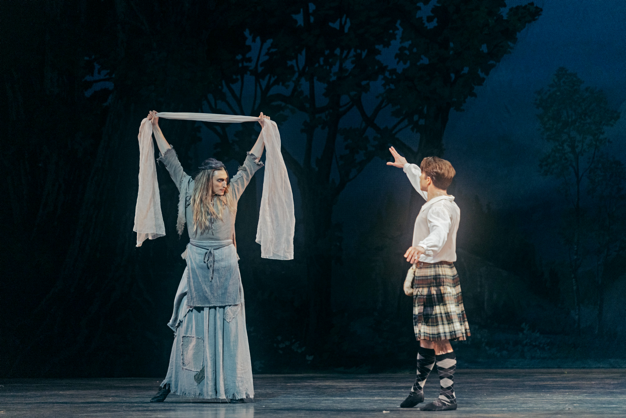 At La Sylphide, we have hot men in argyle socks and matching kilts doing a Riverdance. Then we have this queen, who all at once is giving me a Macbeth witch, crossed with a pre-transformation Helena Bonham Carter as the fairy godmother in live-action Cinderella.