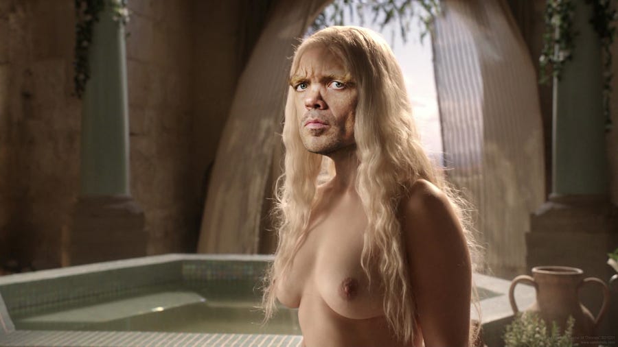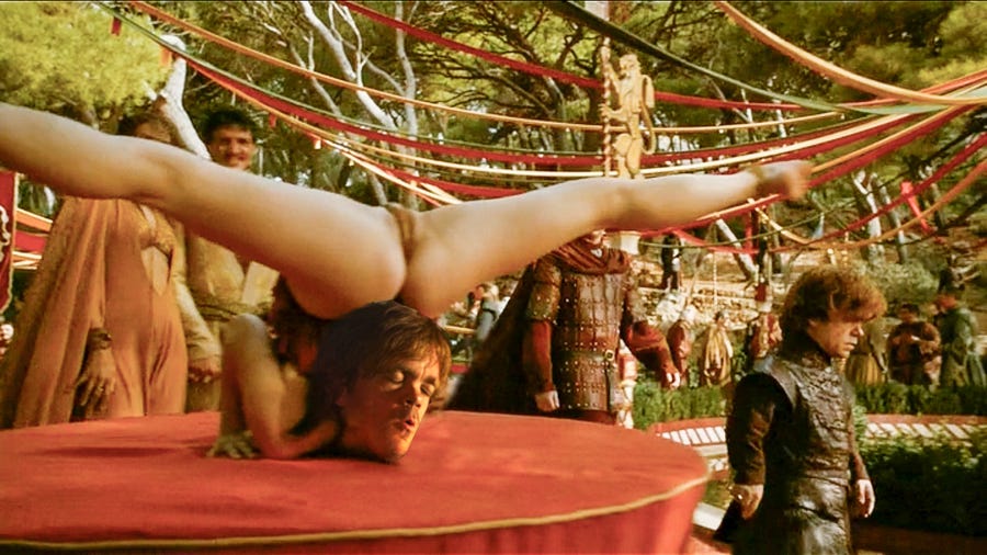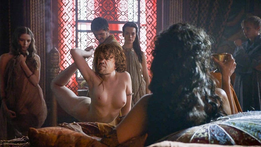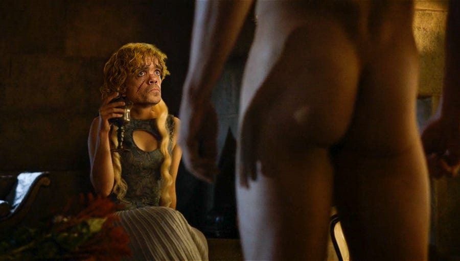 Disclaimer: I don’t watch Game of Thrones– the first glimpse of an episode that I walked in on was that scene where the guy’s stomach is getting eaten through by rats via a ye-olde bucket, and I was like, “I’m good.” But I’ve been around people watching it for a couple of years now, and it seems like they watch the show for two main draws: that one guy, Tyrion, and the ample serving of old-timey BB&P (boobs, butts, and pubes).