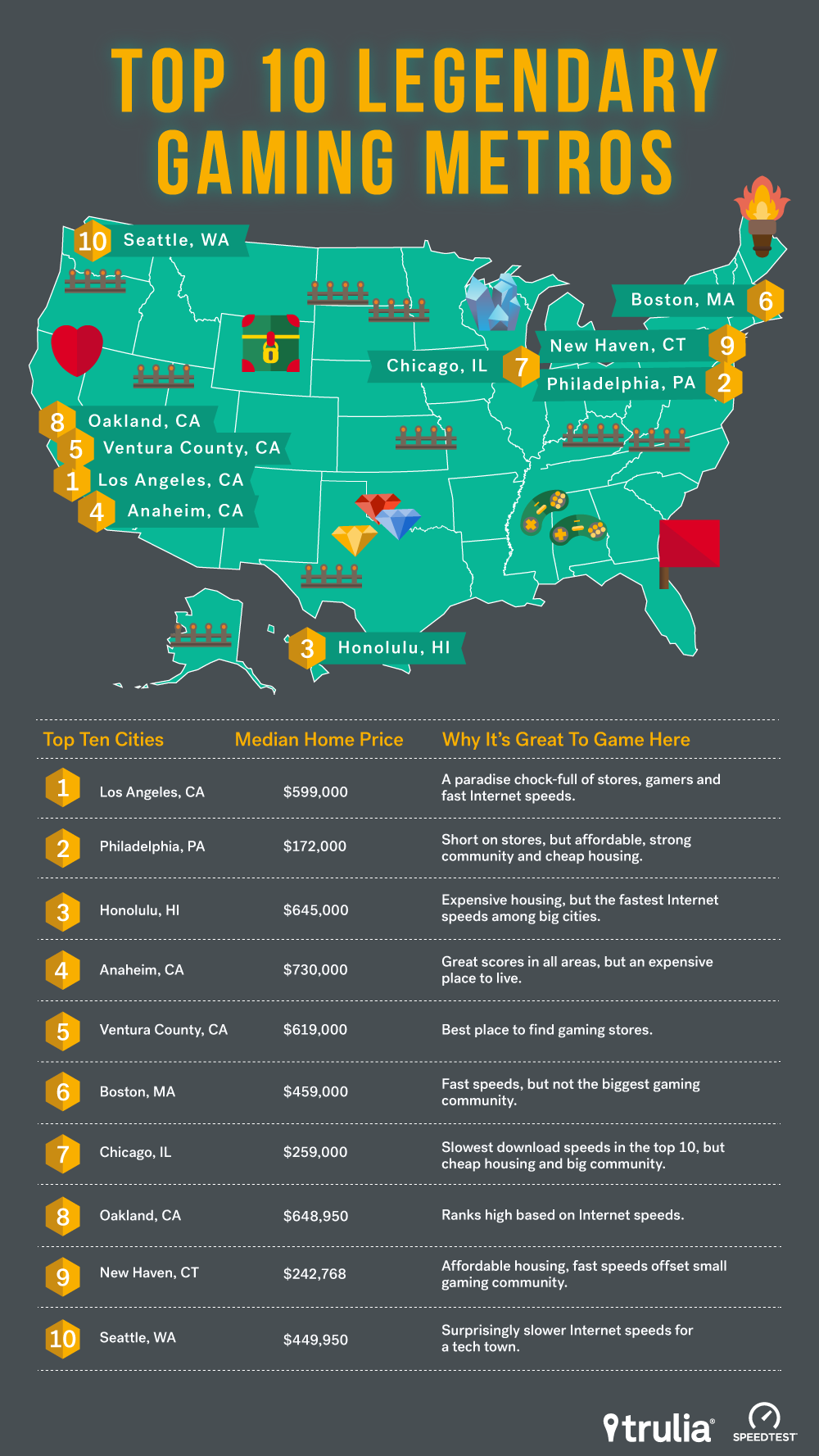 In case you thought gamers based their housing decisions only on ease of access to glare-reducing shutters, real estate analytics firm Trulia and Ookla (the company that comes up high in the results when you search for “test my Internet speed”) collaborated to produce an infographic list—the Top 10 Legendary Gaming Metros—with the intention of helping gamers find that perfect windowless basement with a healthy number of three-prong outlets. And the Oakland-Berkeley-Hayward metro area came in at #8, weirdly.